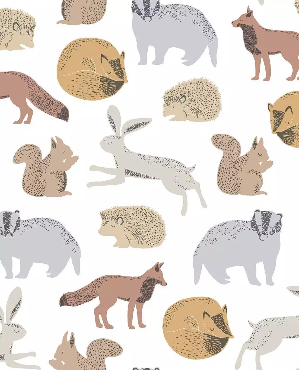 Waschbären, Füchse und Igel.Diese tolle Tapete bringt damit Abwechslung und Farbe ins Kinderzimmer.
