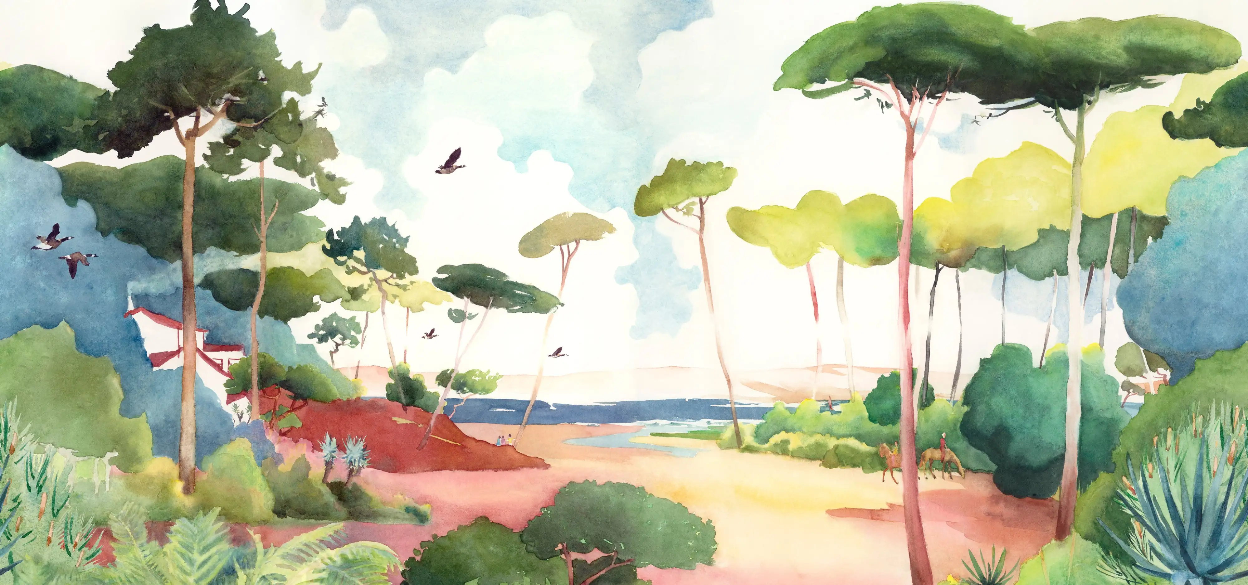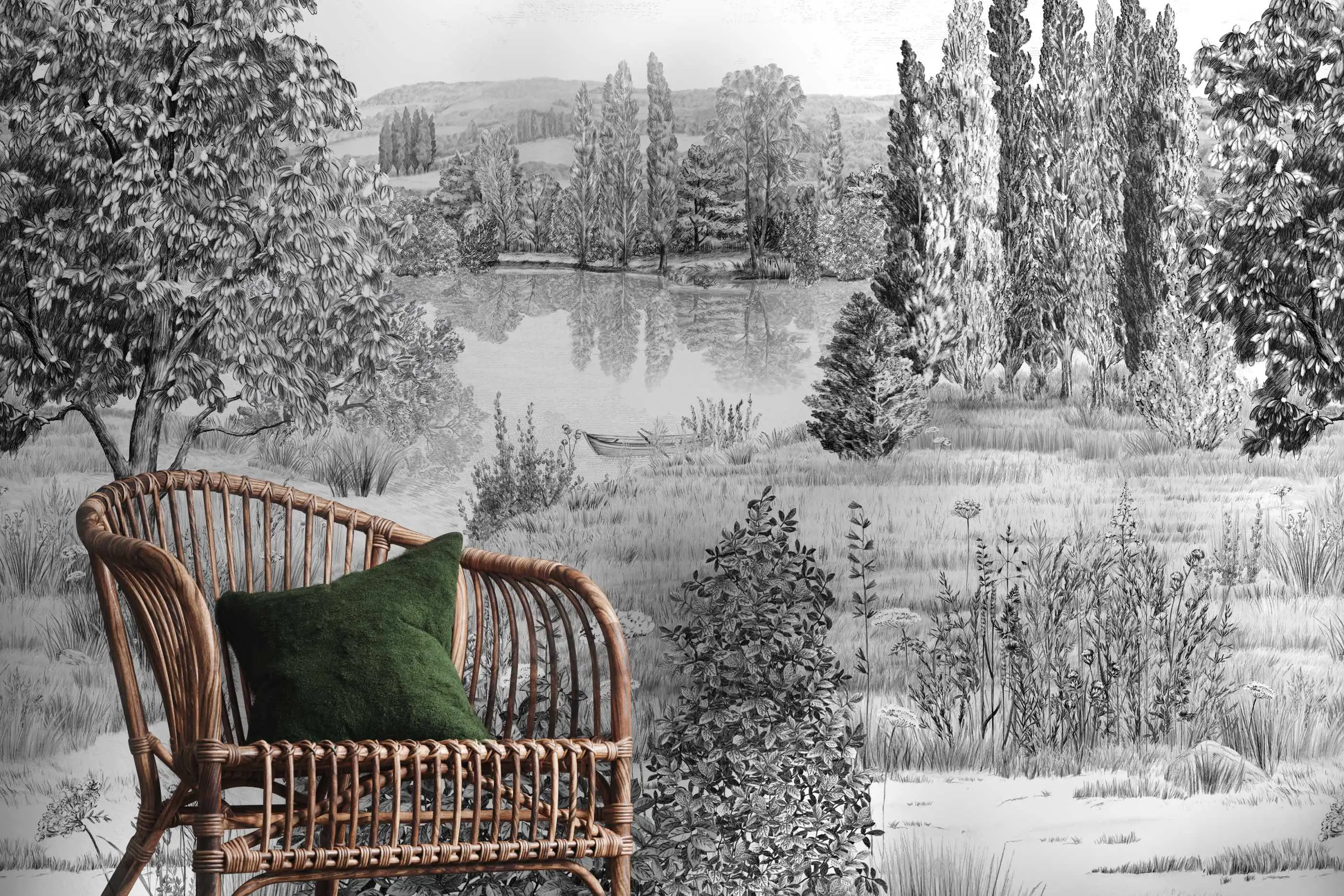 Atmen Sie die frische Luft ein und entfliehen Sie dem Panorama der "Campagne", einer großen bukolischen Wiese am Rande des Flusses, um im Schatten der hohen Bäume neue Energie zu tanken. Diese poetische, ruhige und beruhigende Landschaft wurde von Martine Dubreucq und Isabelle Parmentier geschaffen. Die Arbeit wurde von Hand mit einer Graustufen-Technik mit einem Stift und Bleistiften ausgeführt.