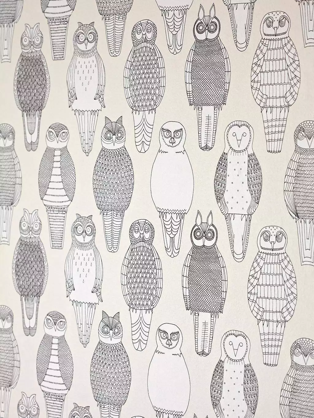 Abigail Edwards' Owls of the British Isles. Zehn verschiedene Eulen Arten, jede mit eigenem Ausdruck, wachen still über die Wand – von der Schneeeule bis zum Steinkauz. In feinen, handgezeichneten Linien entsteht ein rhythmisches Muster, das Ruhe und Charakter ausstrahlt. Die Tapete wirkt grafisch, klar und charmant verspielt – ein leises Spiel zwischen Naturbeobachtung und Design.