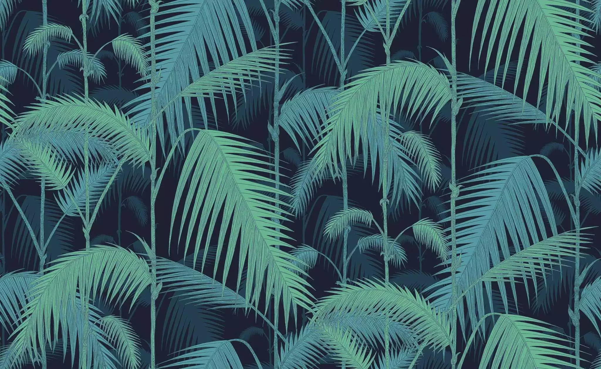 Elegante Palmwedel in Aquatönen vor intensiv dunklem Hintergrund, schaffen auf dieser Tapete eine salonhafte Atmosphäre.