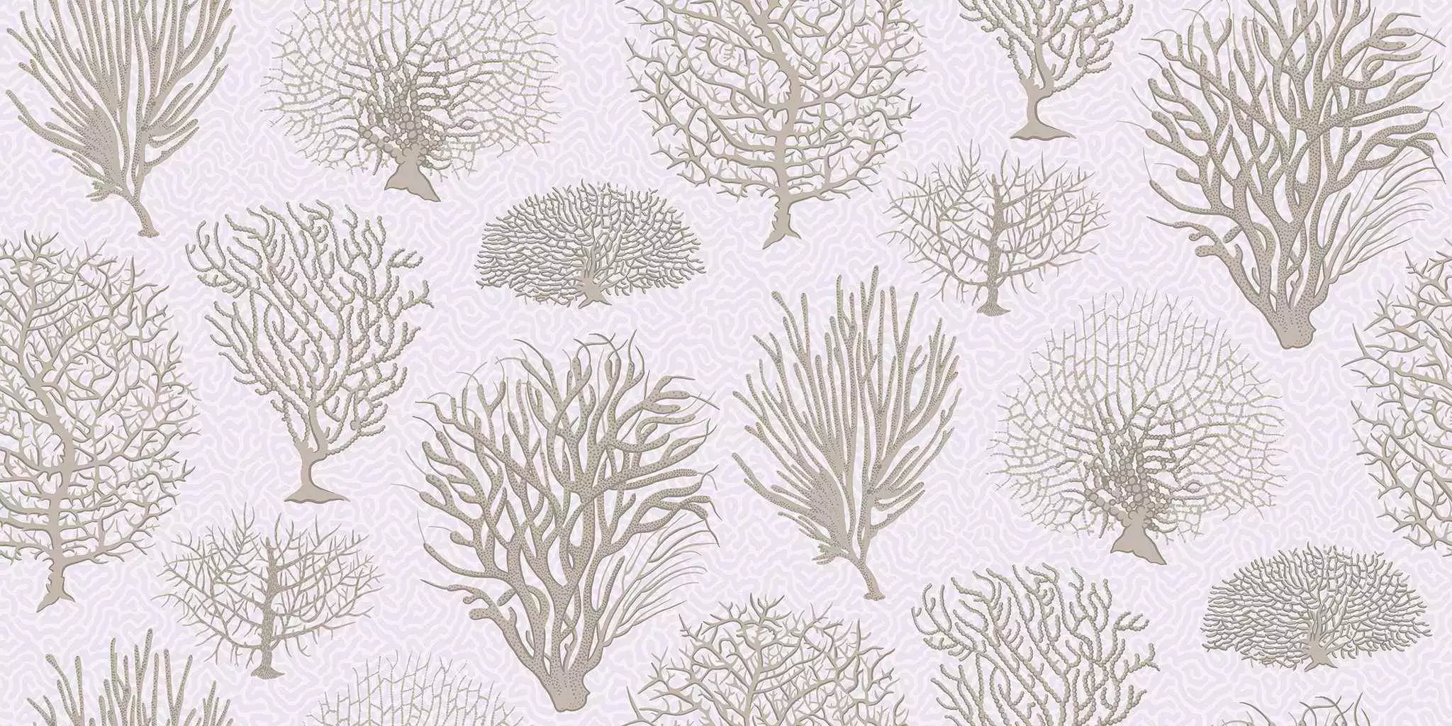 Seafern, col. 10 zeigt fein stilisierte Korallenformen, die gleichmäßig über die Fläche verteilt sind. In warmen Gold- und Bronzetönen entfaltet sich eine ruhige Eleganz, die an die stille Schönheit des Meeresbodens erinnert. Das Motiv wirkt gleichzeitig naturverbunden und ornamental – fast wie eine Sammlung kostbarer Fundstücke aus der Tiefe. Die Kombination von metallischem Glanz und organischer Formensprache verleiht dem Design edle Zurückhaltung und besondere Raffinesse. Eine Tapete, die zeitlose Eleganz mit einem Hauch Exotik verbindet.