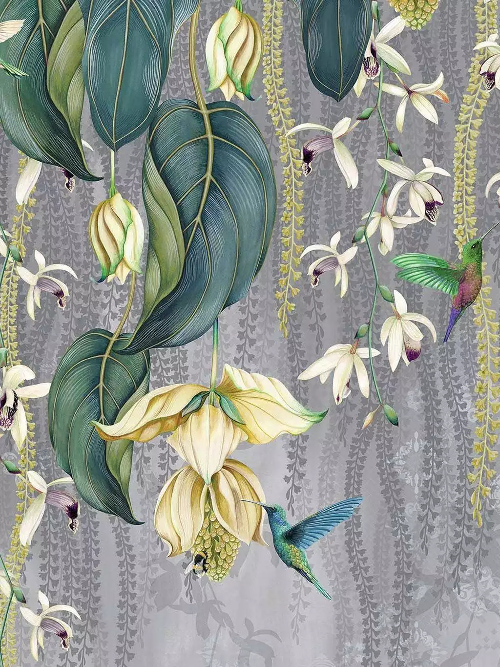 Trailing Orchid zeigt hängende Orchideen und Kolibris auf einem grauen Fond mit feiner Ornamentstruktur. Die Kombination aus kühlen Grau- und Grüntönen mit zartem Gelb und Weiß wirkt klar und ausgewogen. Ein dekoratives Motiv mit ruhiger, exotischer Anmutung. Im Raumbild sind ggf. mehrere Motive abgebildet.