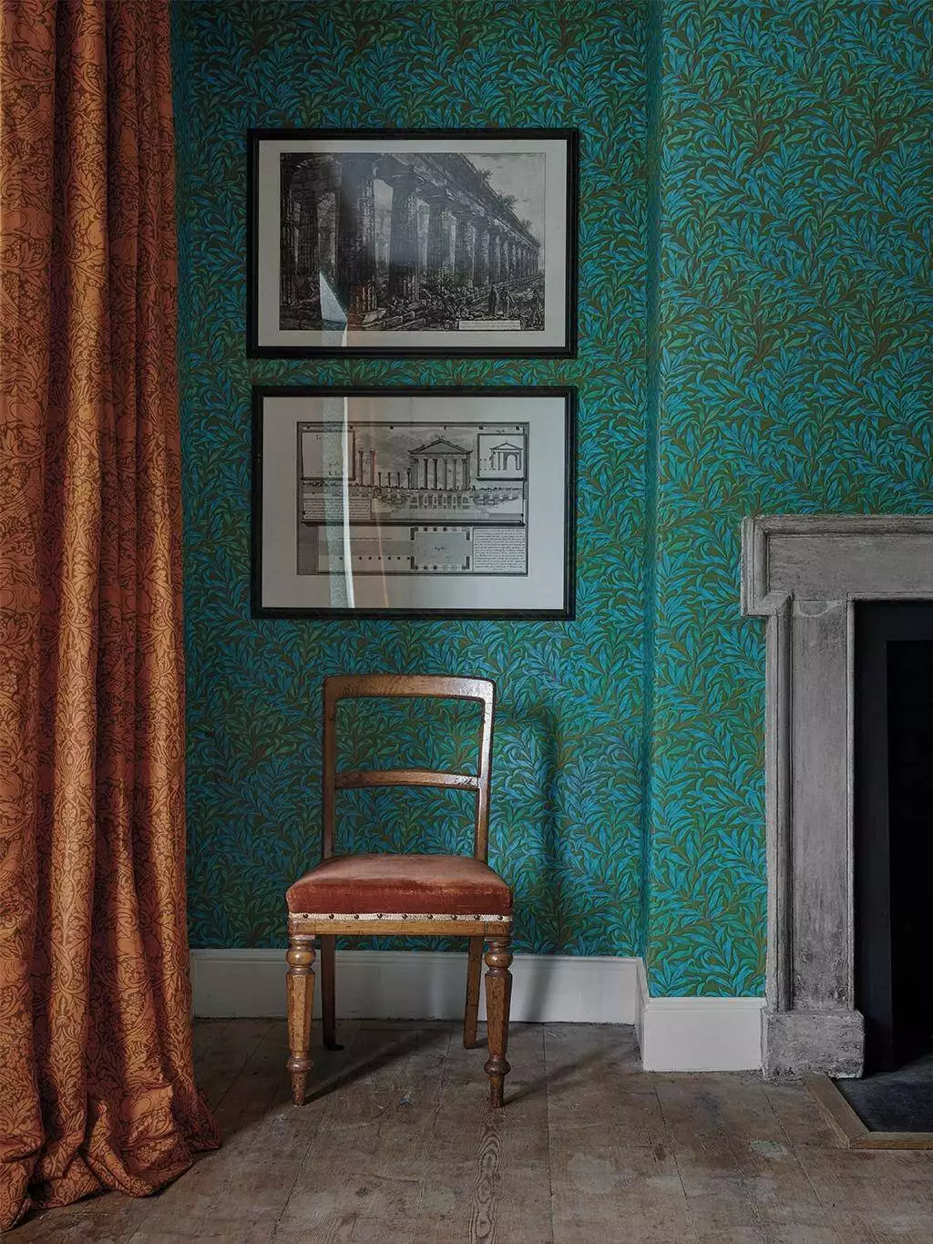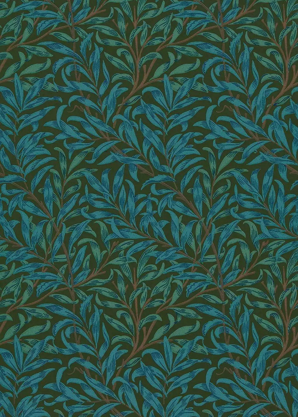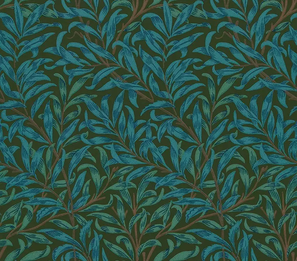 Die Tapete präsentiert eine botanische Ästhetik mit geschwungenen Weidenzweigen und Blättern, als wären sie vom Wind bewegt. Gefärbt ist dieses Muster in der angesagtesten Farbkombination aus dieser Kollektion: Olive und Türkis.