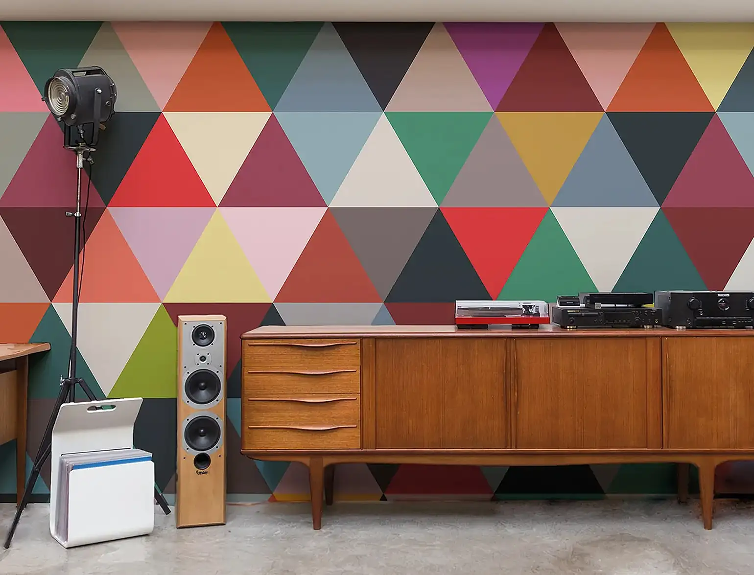 Regelmäßige Dreiecksformen, die sich optisch zu Rauten ergänzen, und die tonige Farbigkeit einer 50er-Jahre-Palette kennzeichnen das Wallpaper „Mosaic“. Rauten und Dreiecke weist auch das Wandpaneel „Circus“ auf, allerdings komplexer in prismenartiger Anordnung. Hier überwiegen exquisite Mischfarben in Violett, Orange, Türkis und Grün.
