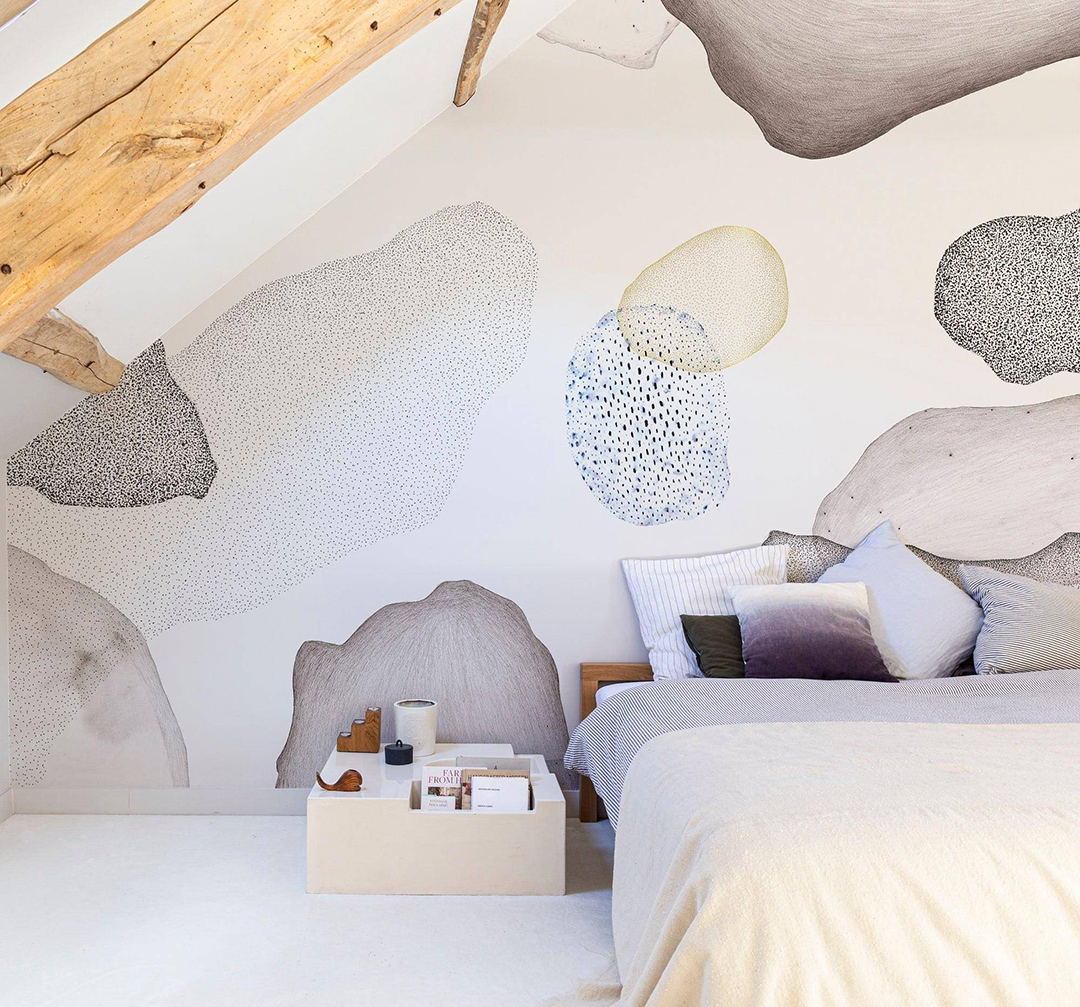 Die Wandmalerin und Designerin Alix Waline hat für Bien Fait abstrakte Schwarz-Weiß-Landschaften geschaffen. Diese erwachsen aus organischen, von Mineralien inspirierten Formen, die auf der Fläche schweben, sich sanft berühren oder ineinander verschmelzen. Visuelle Partituren, die das Licht zu vertonen scheinen und die Wahrnehmung herausfordern. Waline hat die Dessins der Tapeten „Corps Céleste“ (dt. Himmelskörper) und „Apesanteur“ (dt. Schwerelosigkeit) mit Bleistift, Tinte und Filzstift auf großformatige Papiere gezeichnet und in einem zweiten Schritt zu zwei Panoramen komponiert. Die so entstandenen Landschaften erinnern an ferne Planeten, in denen Felsfragmente wie schwerelose Blasen wirken und der Tapete einen pulsierenden Rhythmus verleihen.