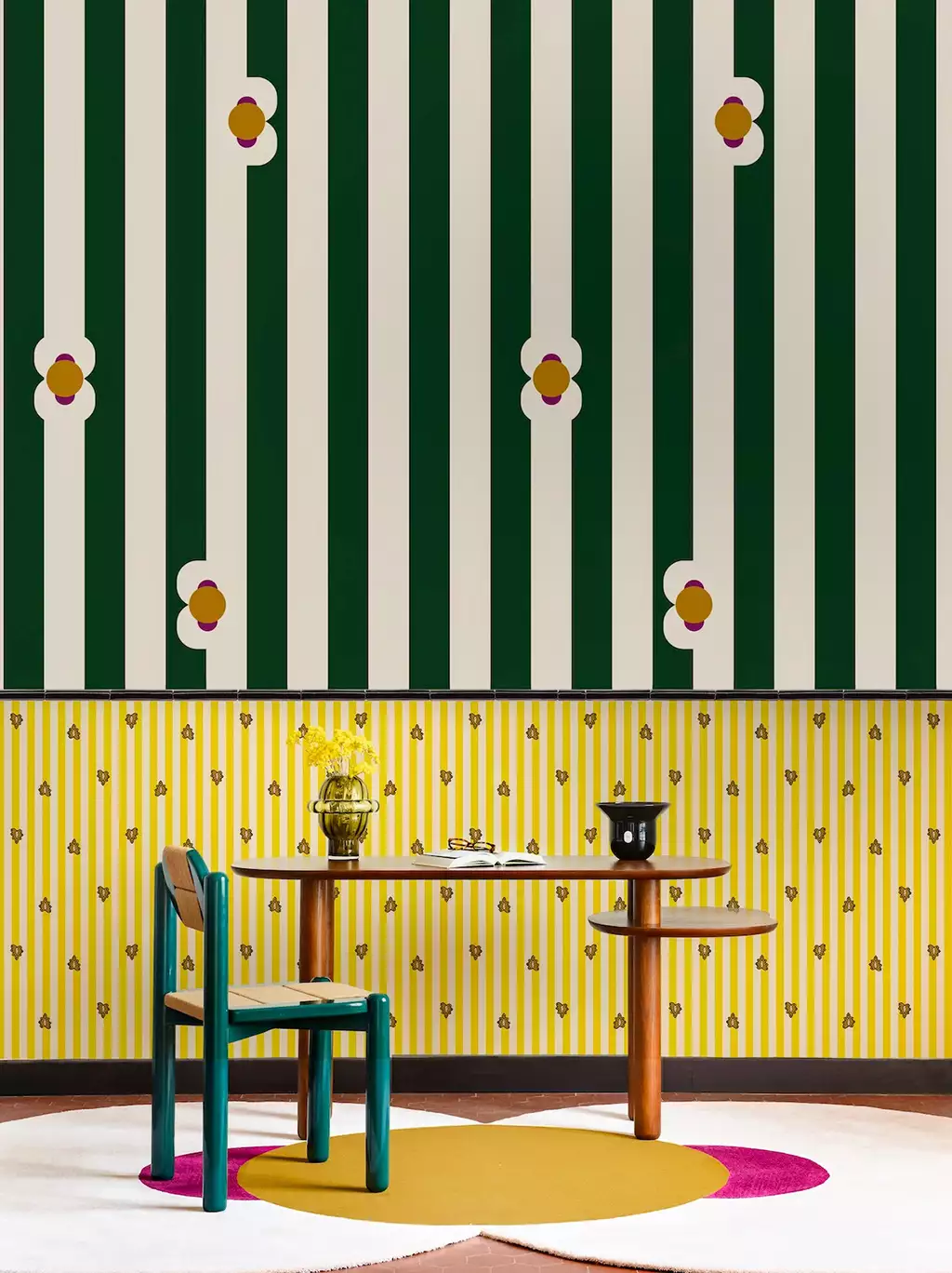 So auch die für Bien Fait kreierten Tapeten „Maïoun“ (provenzalisch: Heim, Haus) und „Longo Maï“: Sie duften nach Provence und visualisieren Großzügigkeit durch kräftige Farben und gewagte Streifenspiele. Sie sind in den Farben Granat, Zitrone und Zypresse erhältlich und können wunderbar kombiniert werden – oder auch nicht. Vous avez le choix!