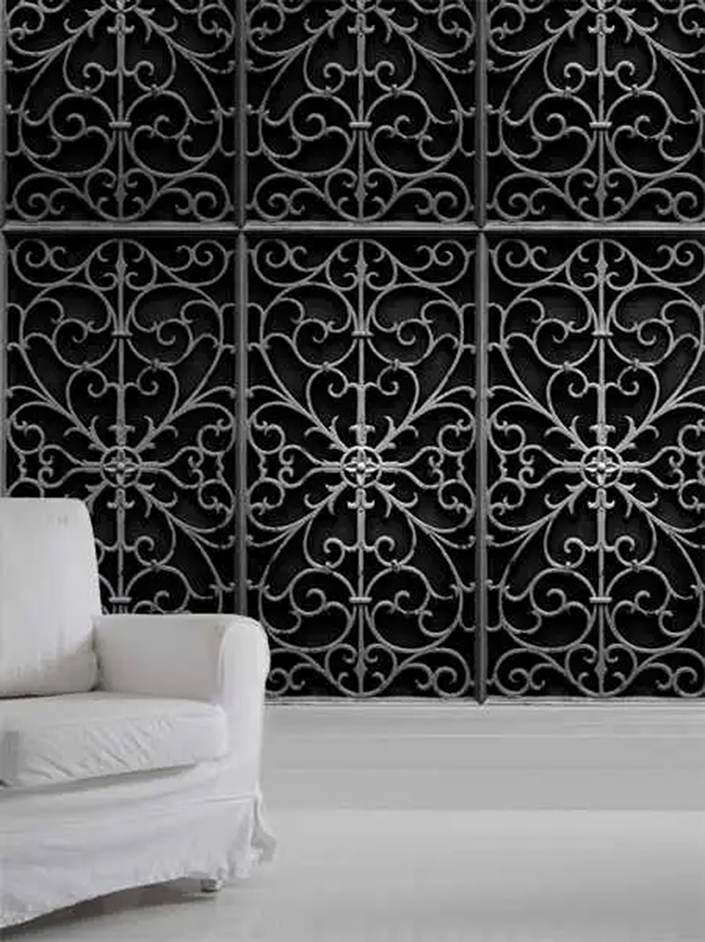Gut zum strengen Charme des Herrenzimmerns passen auch Tapeten mit architektonischen Elementen – vorzugsweise klassizistischer Prägung. Giebel, Säulen und Pilaster mit korinthischen Kapitellen sorgen für eine klare Strukturierung der Fläche, die auf spielerische Elemente nicht verzichtet. Eine ähnliche Wirkung erzielen Tapeten mit historischen Möbeln: sanfte Grauweiß-Kontraste mit interessantem Trompe-l'oeil-Effekt.