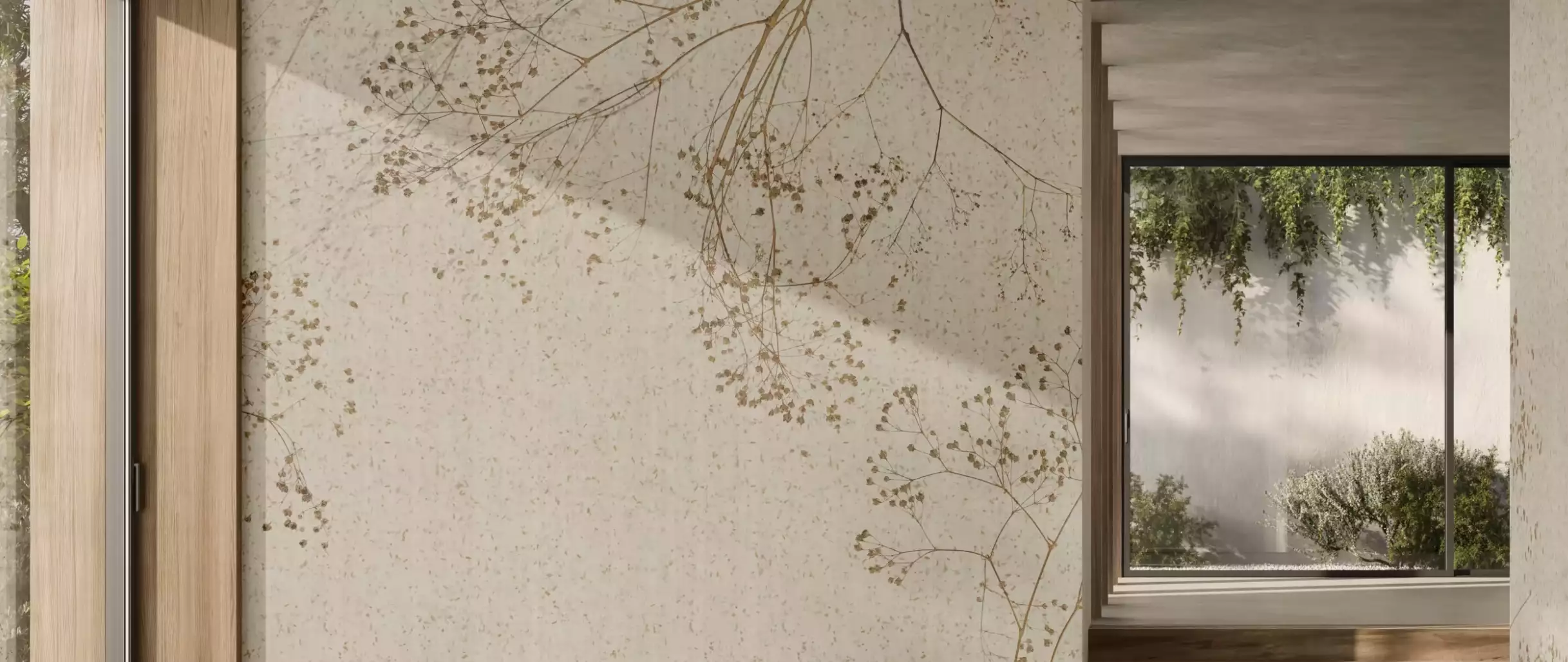 Botanische Tapeten bleiben 2026 ein zentrales Trendthema – doch der Fokus verschiebt sich grundlegend: Weg vom kleinen, wiederkehrenden Rapport hin zu immersiven Wandbildern mit großformatigen Pflanzenmotiven. Farne, Bambus, Monstera-Blätter und florale Szenen dürfen opulent und fast malerisch sein – Motive, die Wände in echte Kunstwerke verwandeln. Der Effekt ist raumöffnend, beruhigend und dennoch ausdrucksstark.