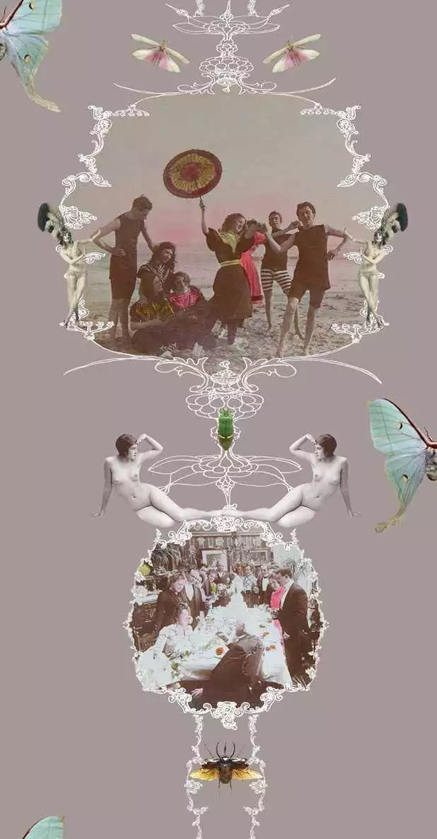 Die Tapete A Bash or Do, col. 01 kombiniert historische Fotografien mit ornamentalen Elementen, Insekten, Aktfiguren und surrealen Details zu einer collageartigen Erzählfläche. Vor einem matten Taupe-Ton entfalten sich nostalgische Szenen – Strandvergnügen, Festtafel, Maskerade – eingebettet in verspielte, fast barocke Rahmen. Die Komposition wirkt wie ein visueller Strom aus Erinnerung, Inszenierung und Ironie. Ein dekoratives Statement mit narrativem Charakter und vielschichtiger Bildsprache.