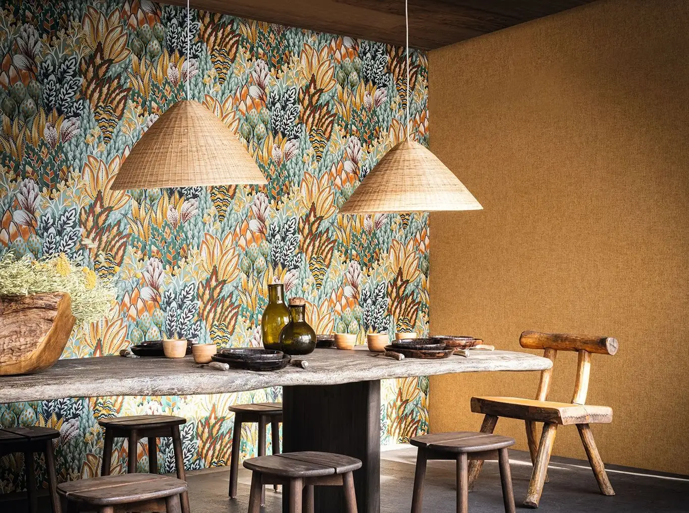 • Großformatige Muster, warme Farben und dezente Metallic-Effekte, die Tiefe und Eleganz schaffen