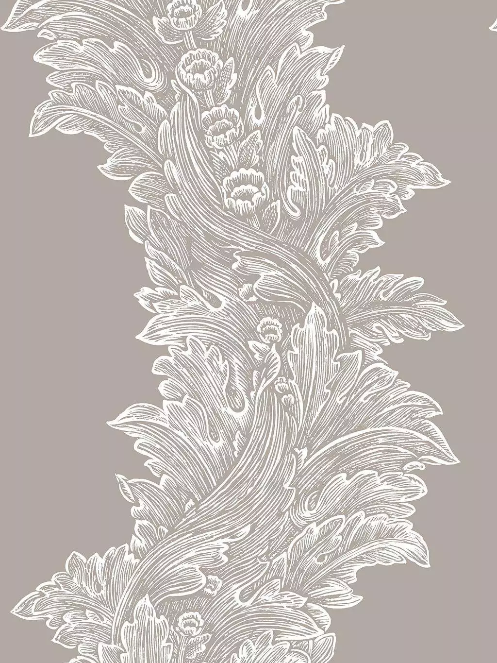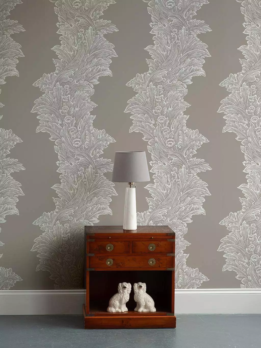 Die Acanthus Leaf Wallpaper von Timorous Beasties aus der Stucco Kollektion 2024 ist eine handbedruckte Tapete, die durch ihre kunstvollen, detailreichen Blattmuster beeindruckt. Die prächtigen Acanthus-Blätter sind filigran in Weiß auf einem edlen, steingrauen Hintergrund gezeichnet und verleihen dem Raum eine majestätische und dennoch zeitlose Eleganz. Die Tapete fängt die Essenz klassischer Ornamente ein und interpretiert sie auf moderne Weise, wodurch sie sich sowohl für traditionelle als auch zeitgenössische Einrichtungsstile eignet.