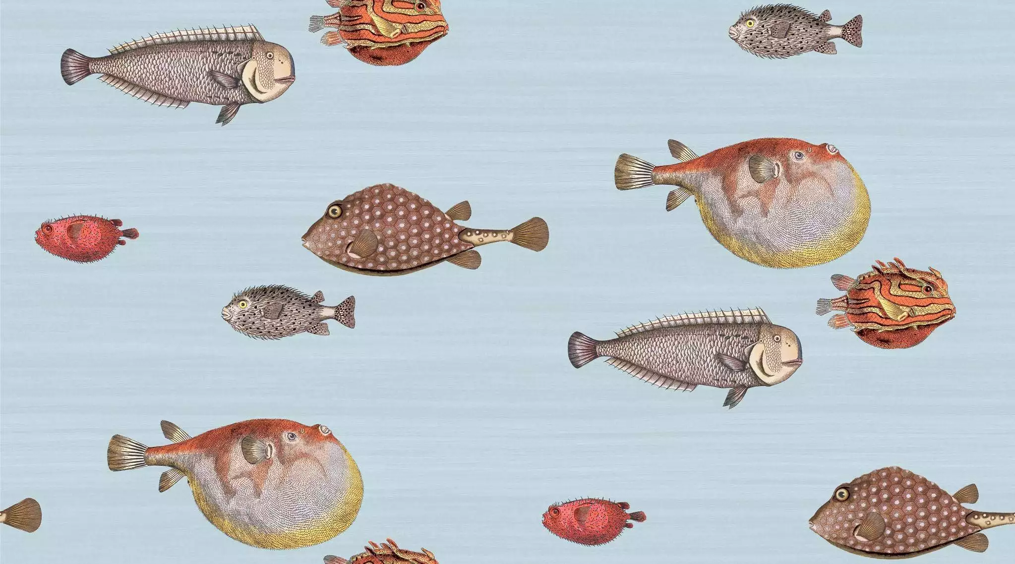 Acquario zählt zu den charakteristischen Entwürfen der Kollektion Fornasetti Senza Tempo von Cole & Son. Die gleichmäßig angeordneten Fischmotive, inspiriert von Piero Fornasettis Zeichnungen, sind fein schattiert und farblich reduziert gehalten. In col. 30 dominieren kühle Blau- und Türkistöne, ergänzt durch dezente Grau- und Silberelemente auf hellem Fond. Das Ergebnis ist eine ruhige, fast schwebende Komposition mit grafischer Klarheit. Die Tapete eignet sich für Räume, in denen Struktur, Rhythmus und eine reduzierte Farbpalette gezielt eingesetzt werden sollen – kunstvoll und zurückhaltend zugleich.