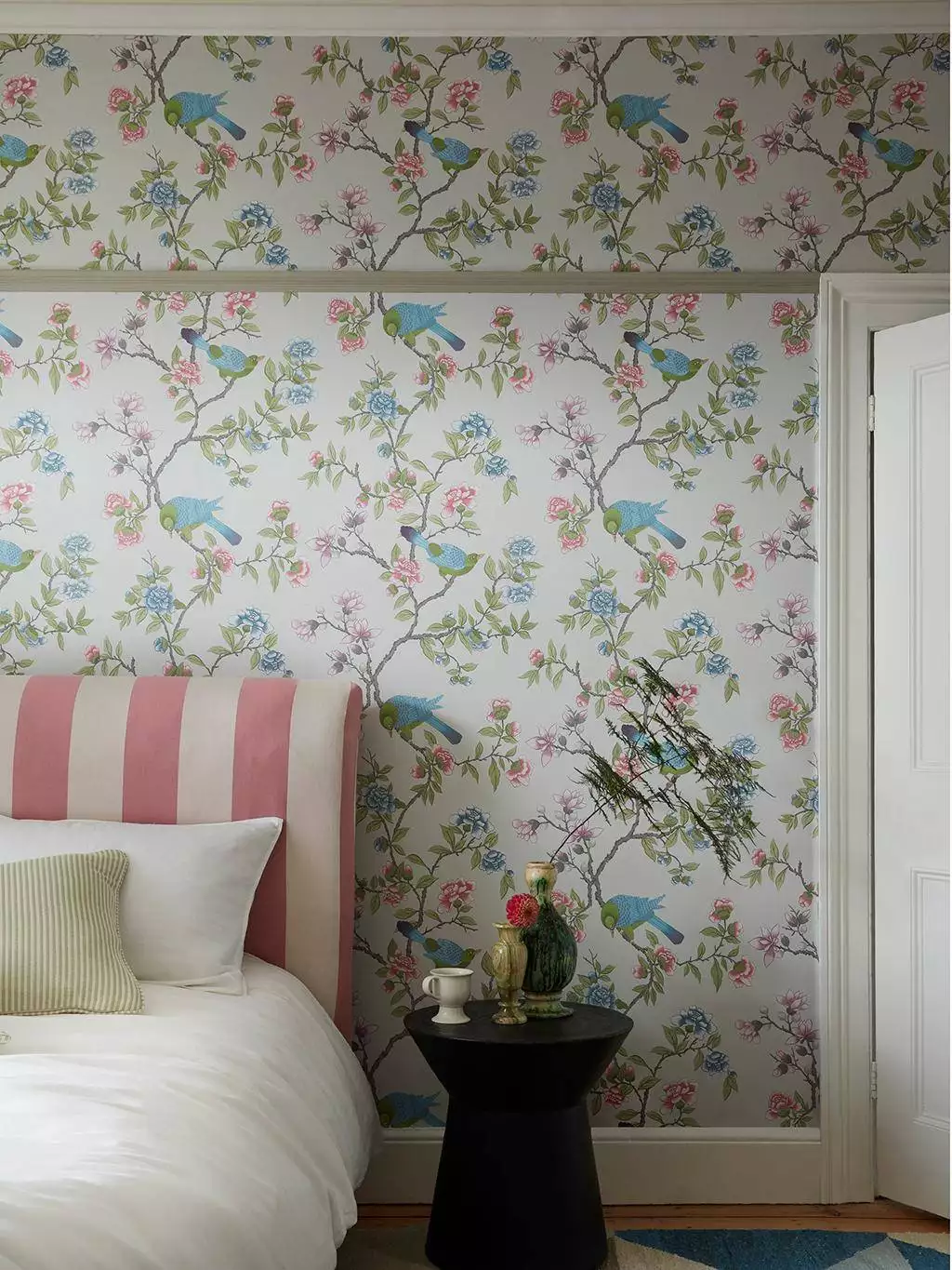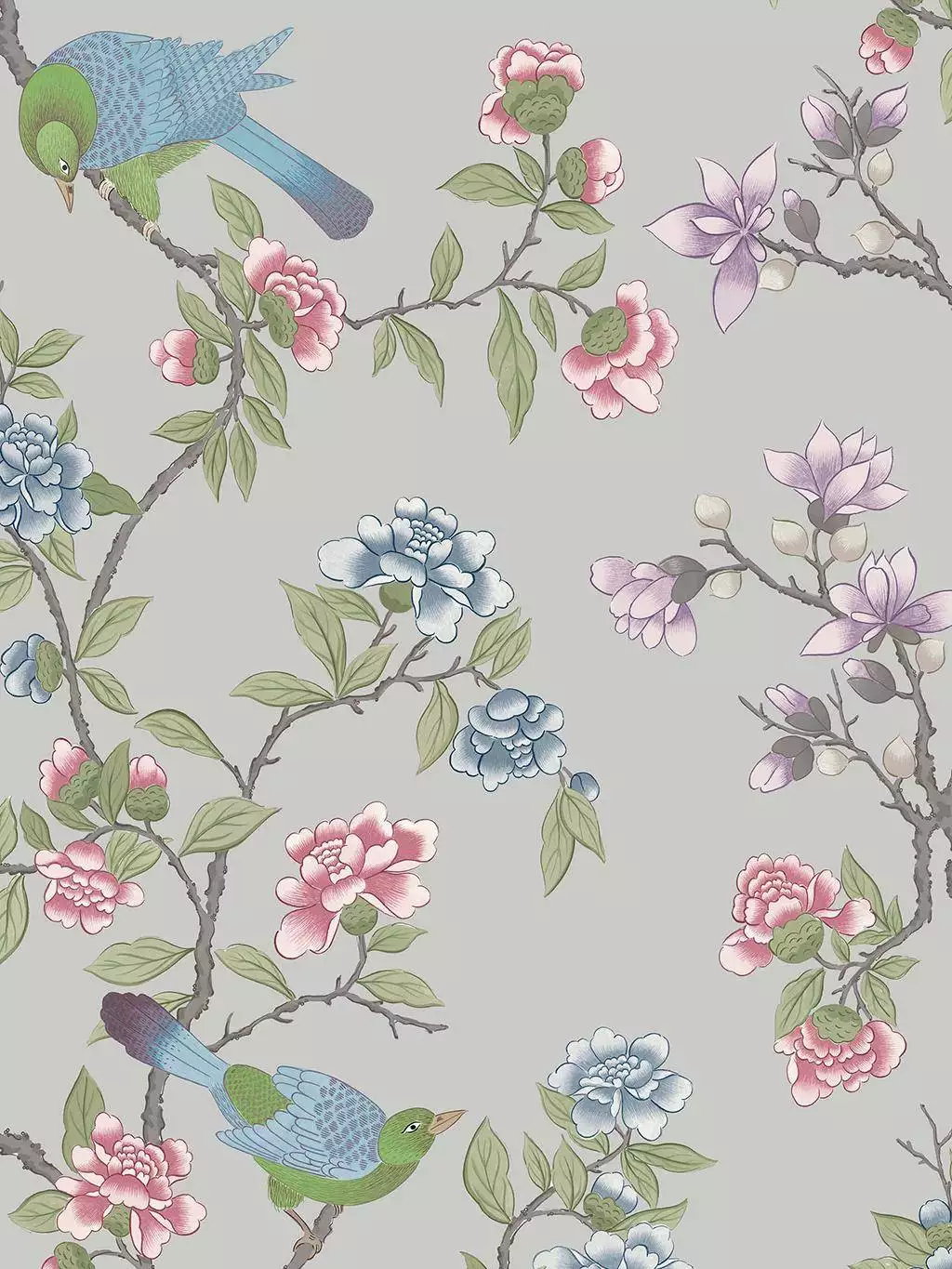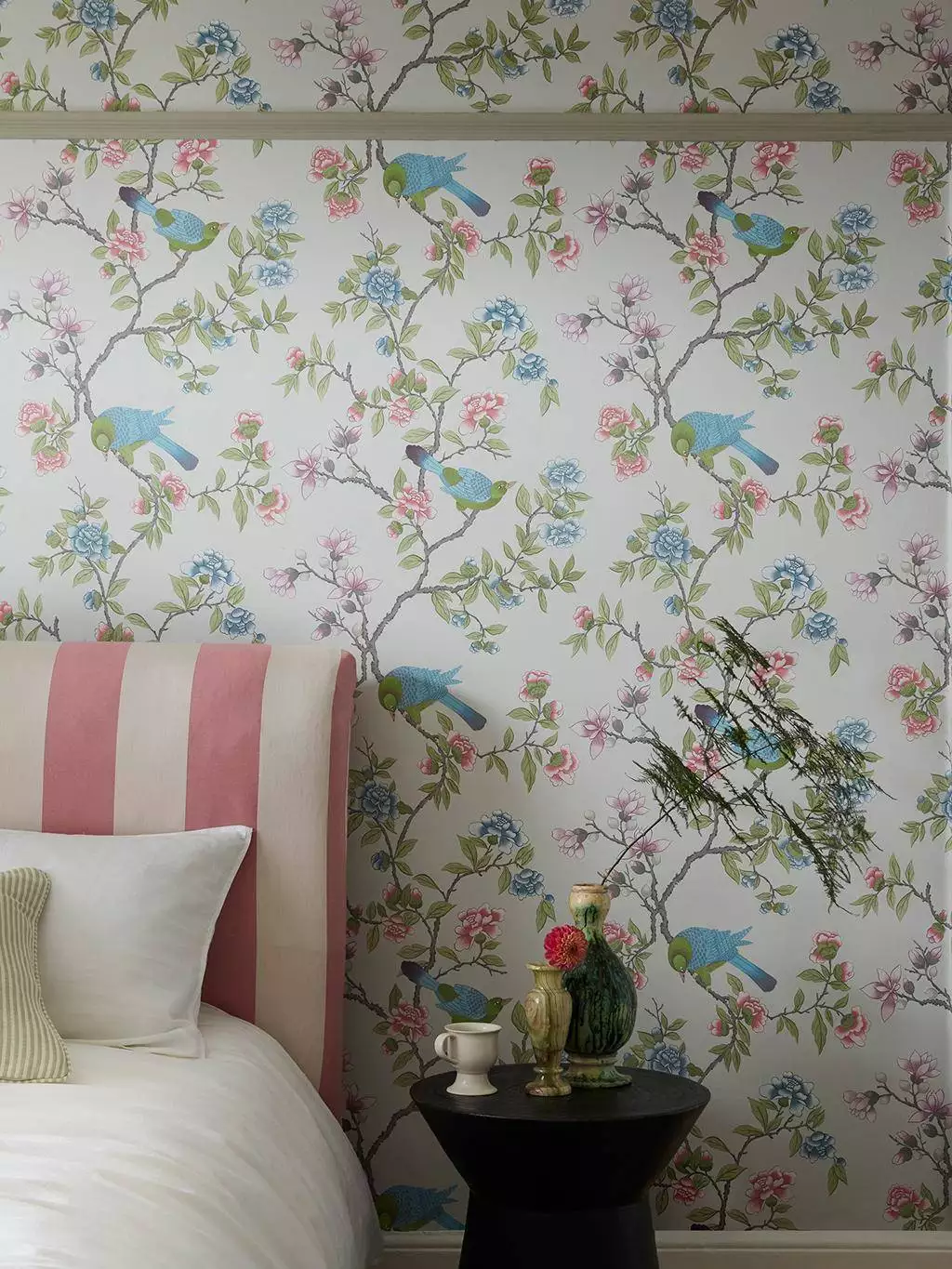 Die Tapete Aderyn von Little Greene basiert auf einer handgemalten chinesischen Tapete aus dem späten 18. Jahrhundert, die im walisischen Landsitz Erddig entdeckt wurde. Das historische Original zeigt fein ausgearbeitete Vögel und Blüten in ausgewogener Komposition. Ein Motiv, das subtil auf das chinesische Prinzip von Yin und Yang anspielt. Magnolien, die man als Sinnbild weiblicher Schönheit kennt, und Pfingstrosen, die traditionell mit Würde und Erhabenheit verbunden sind, prägen das florale Bild. Für Aderyn wurden diese Elemente sorgfältig komponiert und in ein vielseitiges Vogel- und Blumenmuster übertragen, das historische Inspiration mit zeitgenössischer Designer-Tapete verbindet.