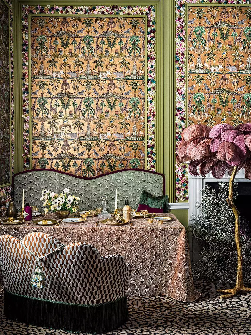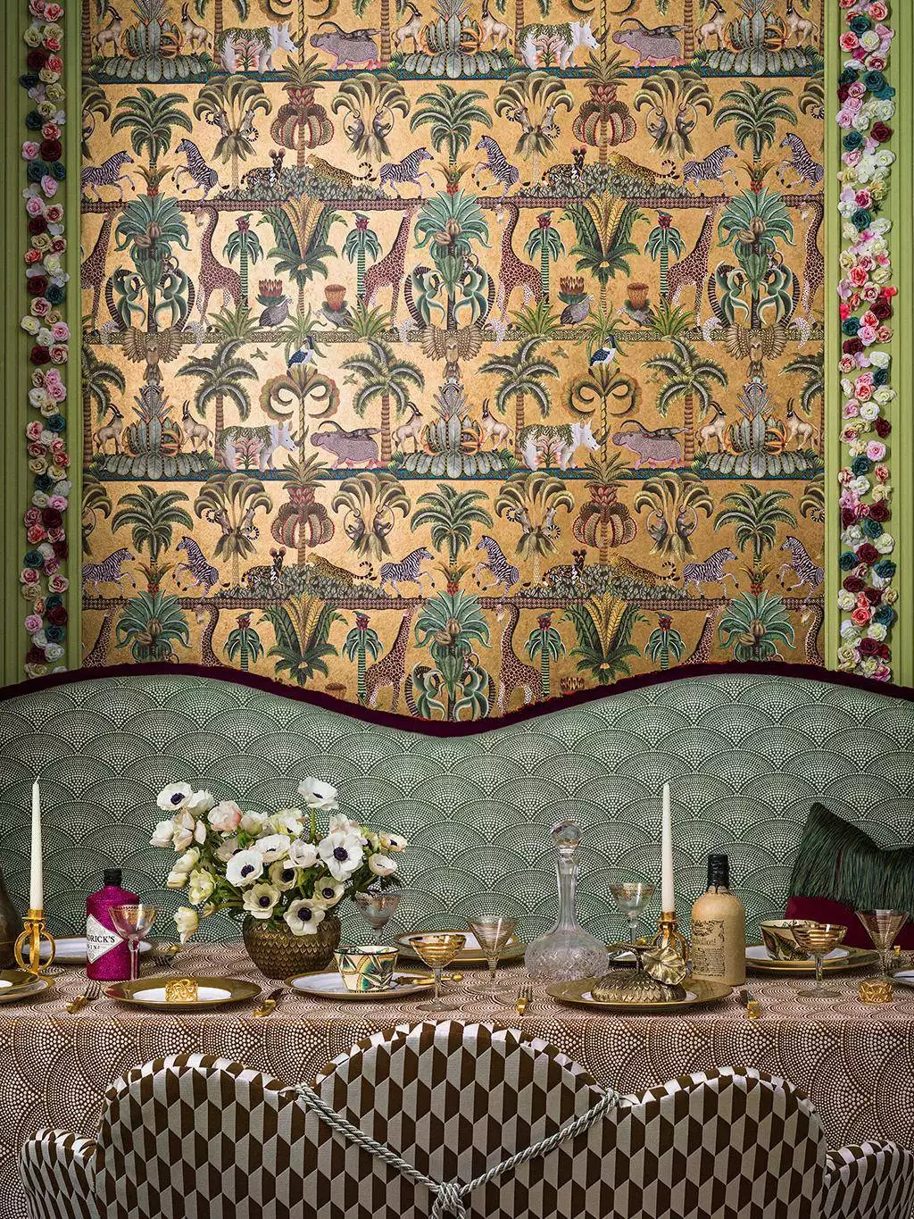 Ardmore Jabula – Afrika Kingdom von Cole & Son fängt die Vielfalt der afrikanischen Tierwelt in einer kunstvollen, strukturierten Komposition ein. Inmitten der Palmen vor goldenem Grund entfaltet sich ein lebendiges Panorama: Ein majestätischer Riesen-Uhu breitet seine Flügel aus, während ballettartige Giraffen, verspielte Zebras und bedrohte Arten wie der farbintensive Afrikanische Wildhund und die imposante Rappenantilope erscheinen.