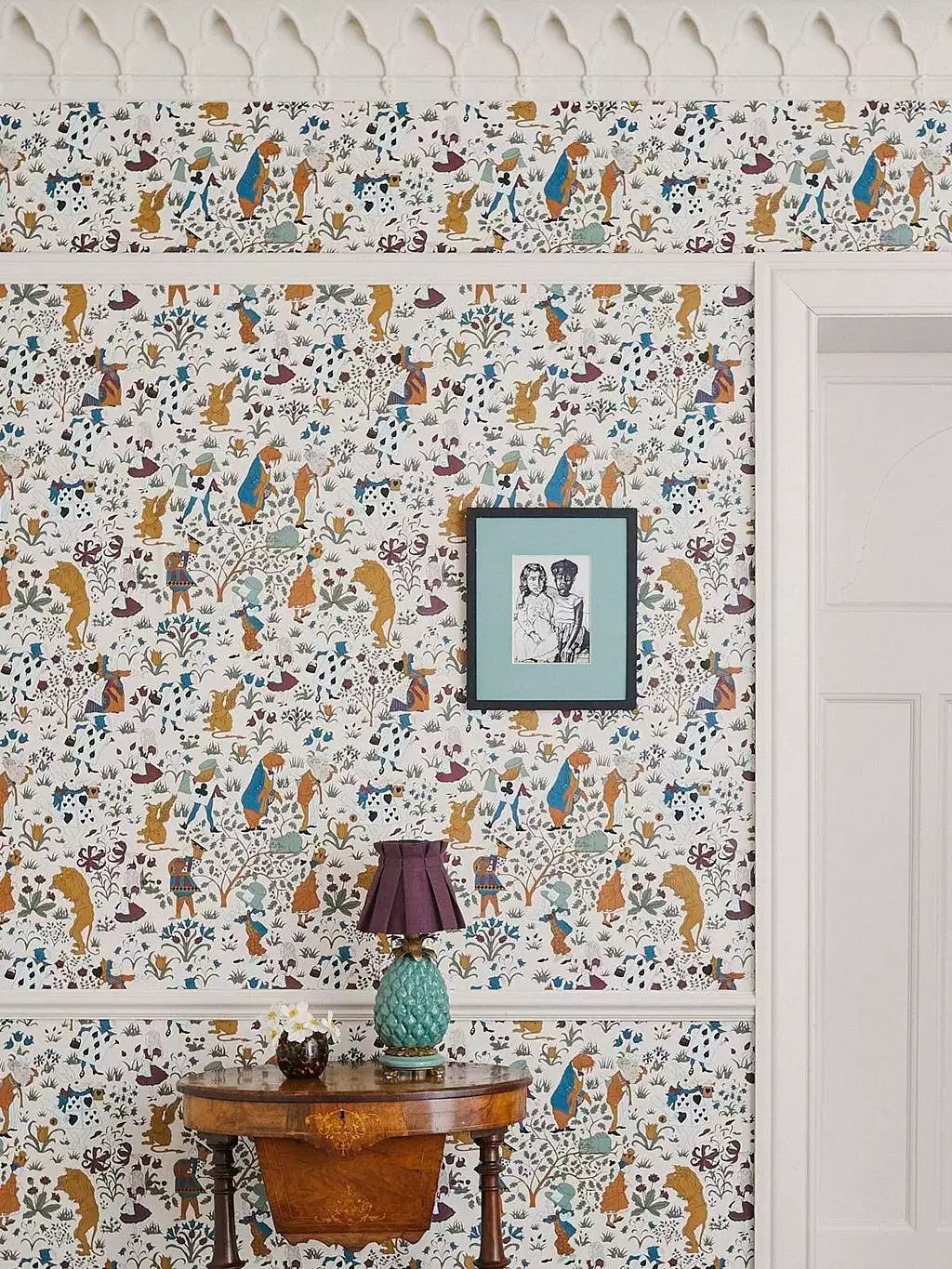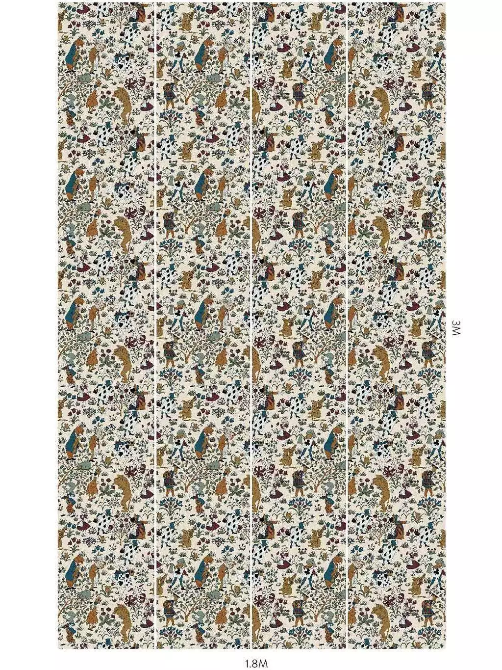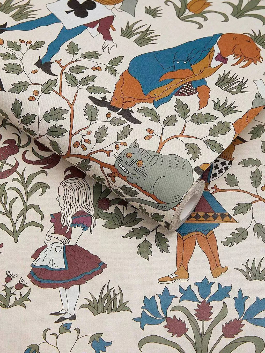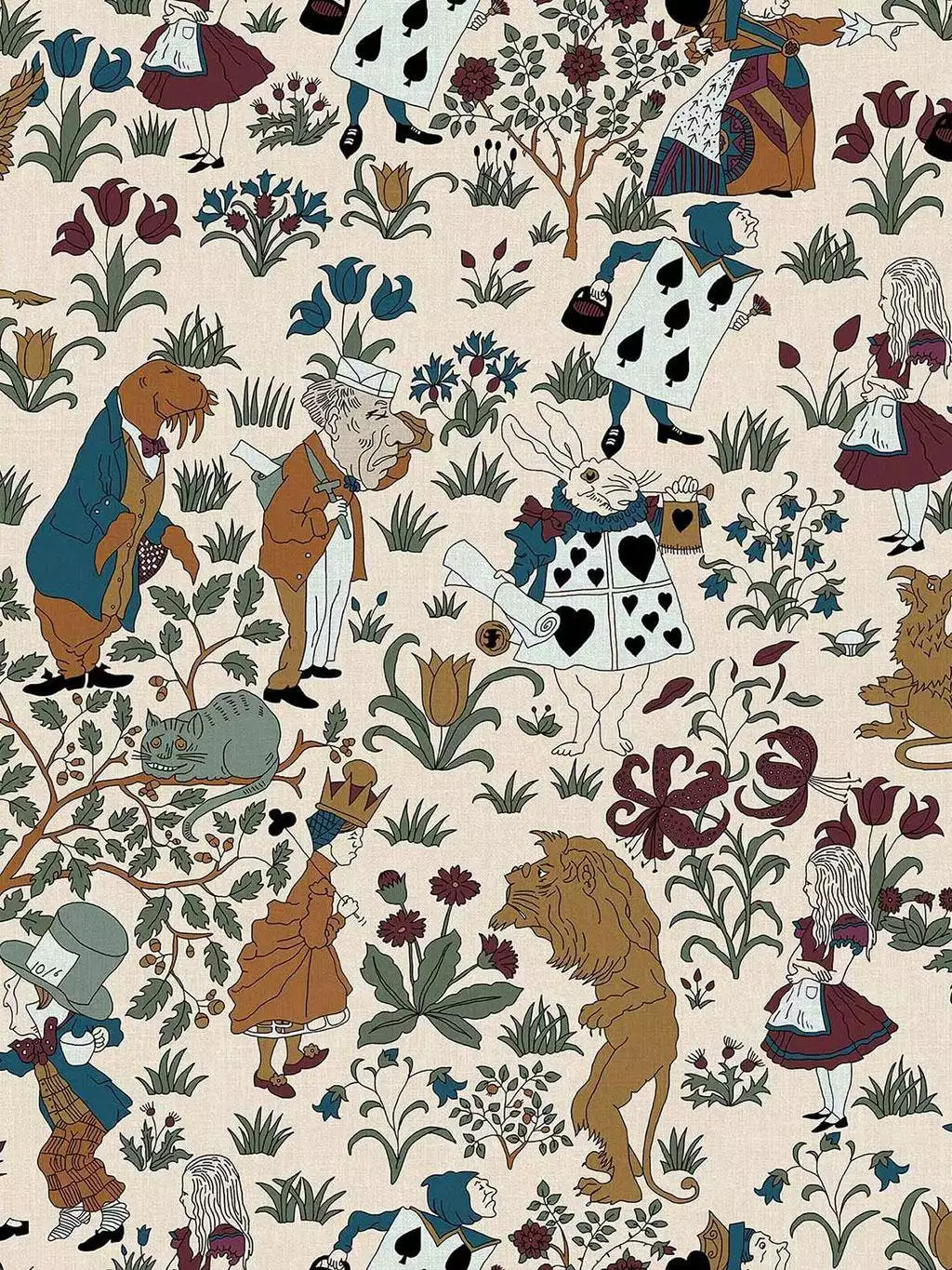 Auf hellem Grund entfalten sich Szenen mit Alice, dem weißen Kaninchen, der Herzkönigin und Kartenwächtern – eingebettet in eine flächige Blumenlandschaft. Die reduzierte Farbpalette mit Ocker, Indigo, Weinrot und Jadegrün verleiht den verspielten Motiven grafische Klarheit. Trotz ihres erzählerischen Ursprungs wirkt die Tapete nicht nostalgisch, sondern entschieden zeitlos.