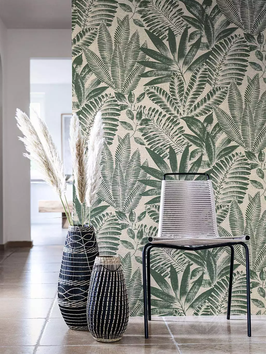 Mit der Tapete Aloes von der französischen Marke Casamanca tauchen Sie Ihre Räume in ein ausladendes Gewirr feiner Farne, opulenter Palmenblätter und filigraner Zweige. Ihre Räume strahlen in Luxus, Komfort und Lebenskunst, aber auf eine schlichte und elegante Art. Das florale Muster ist stilisiert, nicht realistisch. So wirkt die Blätterwelt wie ein kunstvolles Muster, welches aber dennoch die Lebendigkeit und Echtheit der Natur in den Raum zaubert.