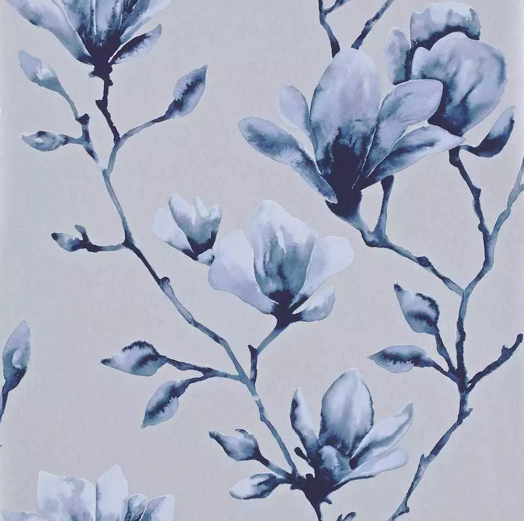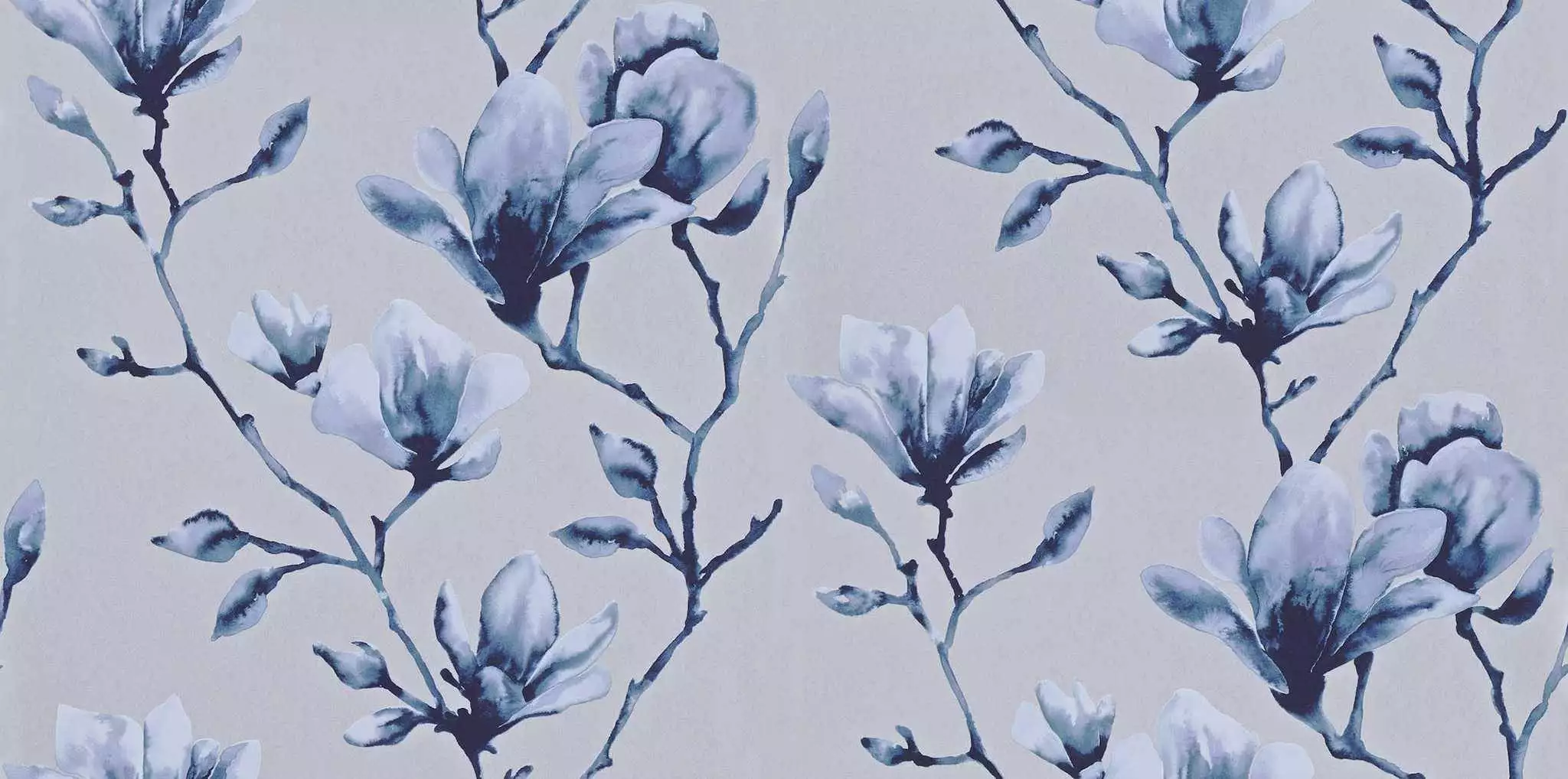 Altje, col.81 zeigt großformatige Magnolienzweige, deren Blüten in intensiven Blautönen auf einem hellen Grund erstrahlen. Die malerische Gestaltung verbindet weiche Farbverläufe mit klarer Zeichnung, wodurch die floralen Formen fast lebendig wirken. Das Spiel zwischen zarten Knospen und üppig geöffneten Blüten erzeugt eine abwechslungsreiche Dynamik und betont die natürliche Eleganz des Motivs.