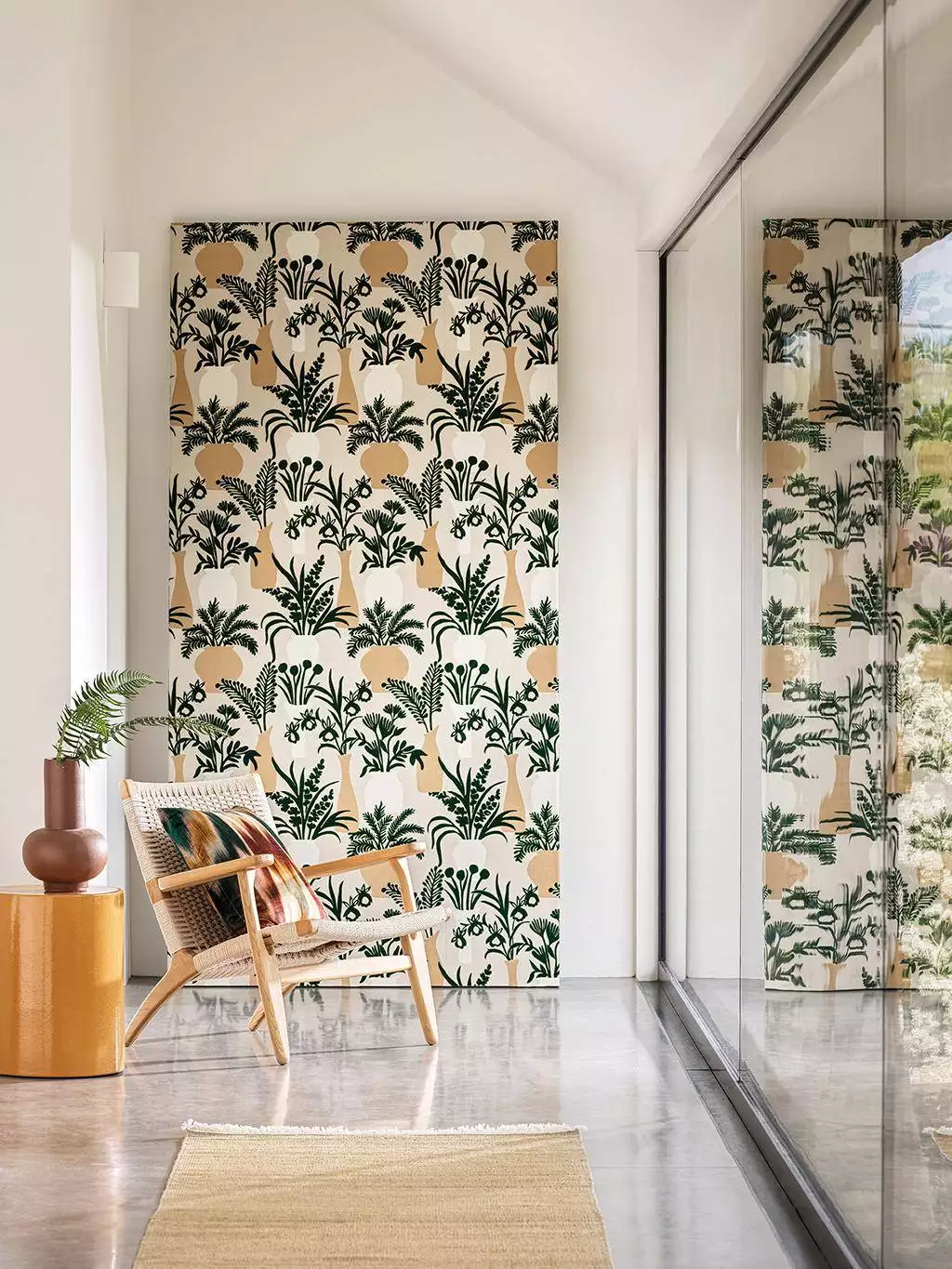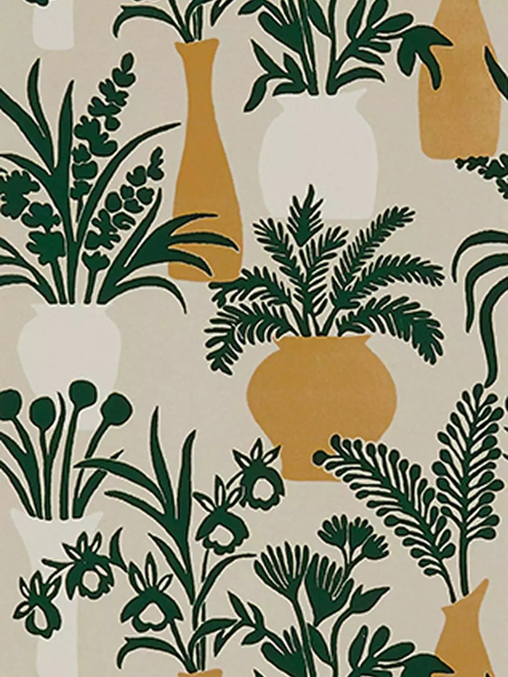 Die Amphora, ein antikes griechisches und römisches Gefäß mit schlankem Hals und zwei Henkeln, ist bekannt als antike Vase. Die gleichnamige Tapete präsentiert ein zeitgenössisches Design mit stilisierten Blumen und Blättern in Vasen.