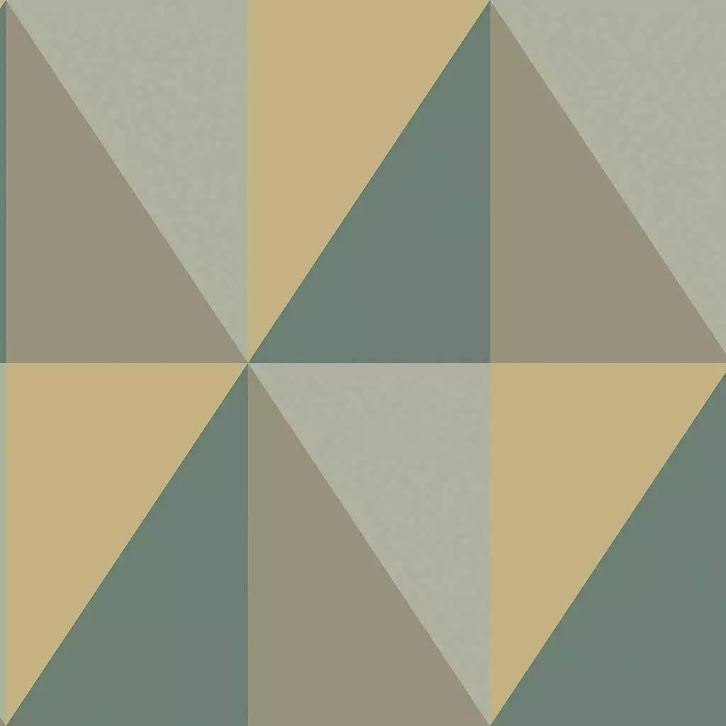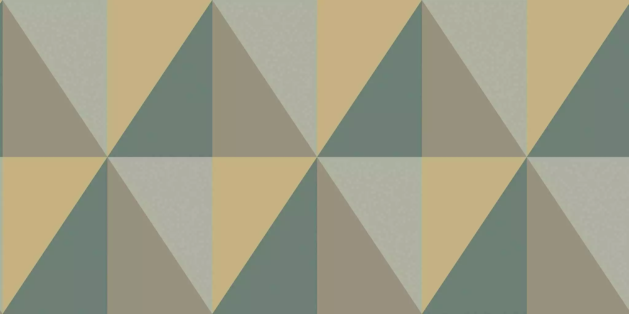 Die Apex Grand Tapete präsentiert ein modernes Design mit ineinandergreifenden Dreiecken. Das Muster aus Dreiecken, welche je nach Blickwinkel Rauten oder Rechtecke formen, verleiht dynamische Note. Diese Variante ist in den Farben Olive, Waldgrün & Metallic-Gold gehalten.