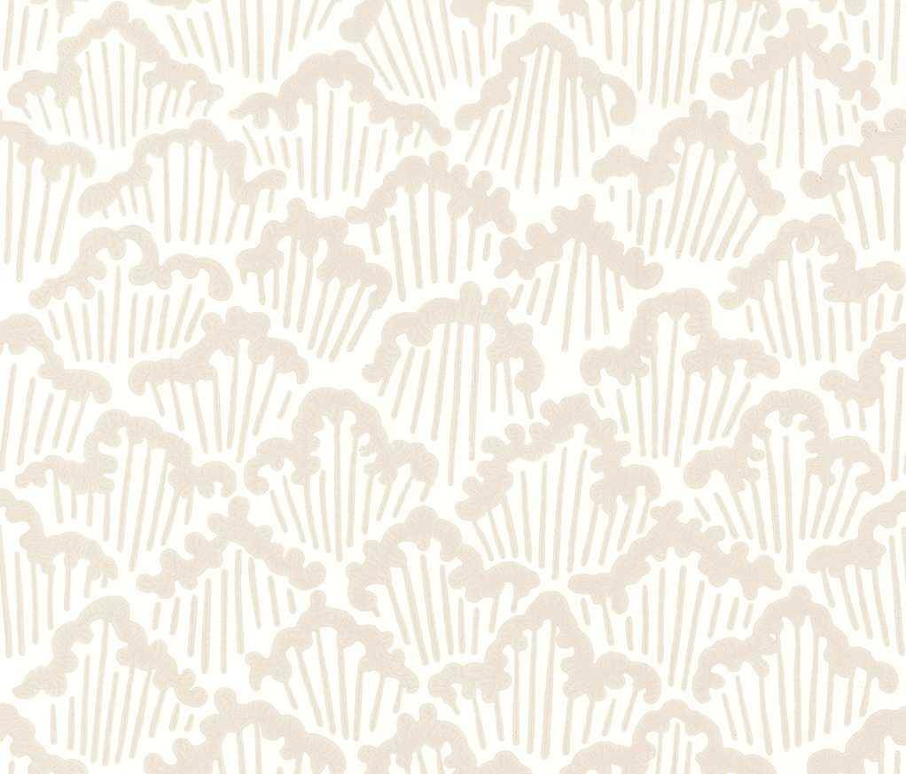 Aranami, col. 01 in Beige, greift die japanische Papierschneidekunst kiri-e auf. Die stilisierten Wellen sind präzise aufgebaut und behalten dennoch eine weiche, fließende Wirkung. Das Muster erinnert an das rhythmische Auf und Ab der Gezeiten.