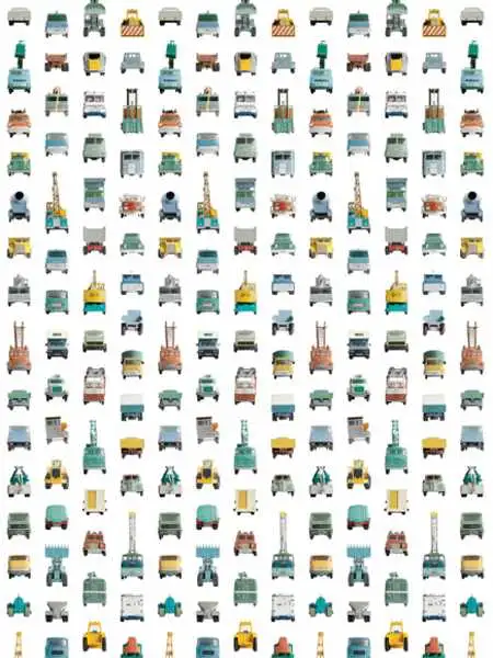 Wallpaper for small and big boys who like tough excavators, tow trucks and fire engines. With these old cars is much played in the sandbox and on the street. The damaged work vehicles give a cool vintage feel to your room.