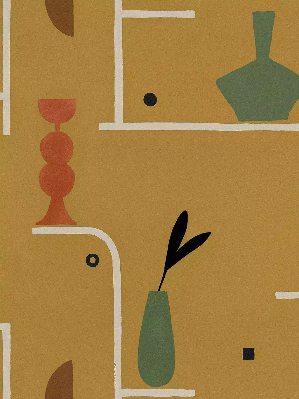Die Tapete Archaeological Forms Ocher von Tres Tintas bringt mit ihrer warmen Ockernuance und geometrischen Komposition einen Hauch von Mid-Century-Charme in den Raum. Inspiriert von archäologischen Fundstücken und minimalistischer Kunst, zeigt das Design stilisierte Vasen, Keramiken und abstrakte Formen, die sich harmonisch in das Gesamtbild einfügen. Die weichen, handgemalten Linien verleihen der Tapete eine organische Ästhetik und unterstreichen ihre künstlerische Eleganz. Perfekt für moderne Wohnräume, Cafés oder kreative Arbeitsbereiche – Archaeological Forms Ocher schafft eine einladende Atmosphäre mit künstlerischem Flair.