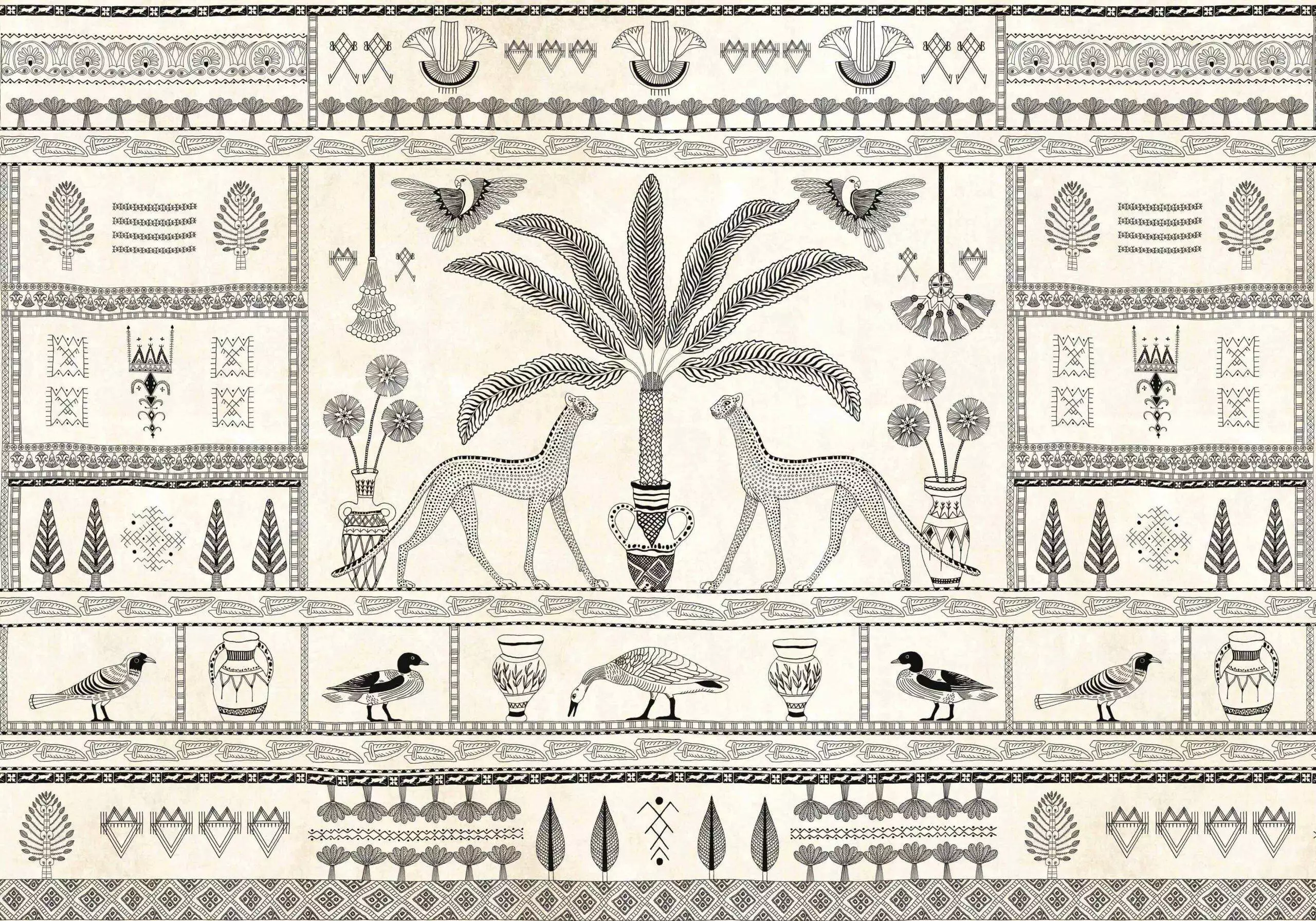 Die Gestaltung erinnert an die Wurzeln alter Handwerkskunst und erzählt Geschichten aus einer längst vergangenen Zeit. Feine Linien zeichnen Tiere, Palmen und Ornamente, die wie Reliefs einer antiken Kultur wirken. In sanften Baumwolltönen gehalten, verbindet das Design natürliche Wärme mit künstlerischer Strenge. Asni Valley, Cotton entfaltet eine ruhige, archaische Kraft, die Räume erdet und gleichzeitig außergewöhnlich macht – wie ein Wandbild, das Vergangenheit und Gegenwart miteinander verknüpft.