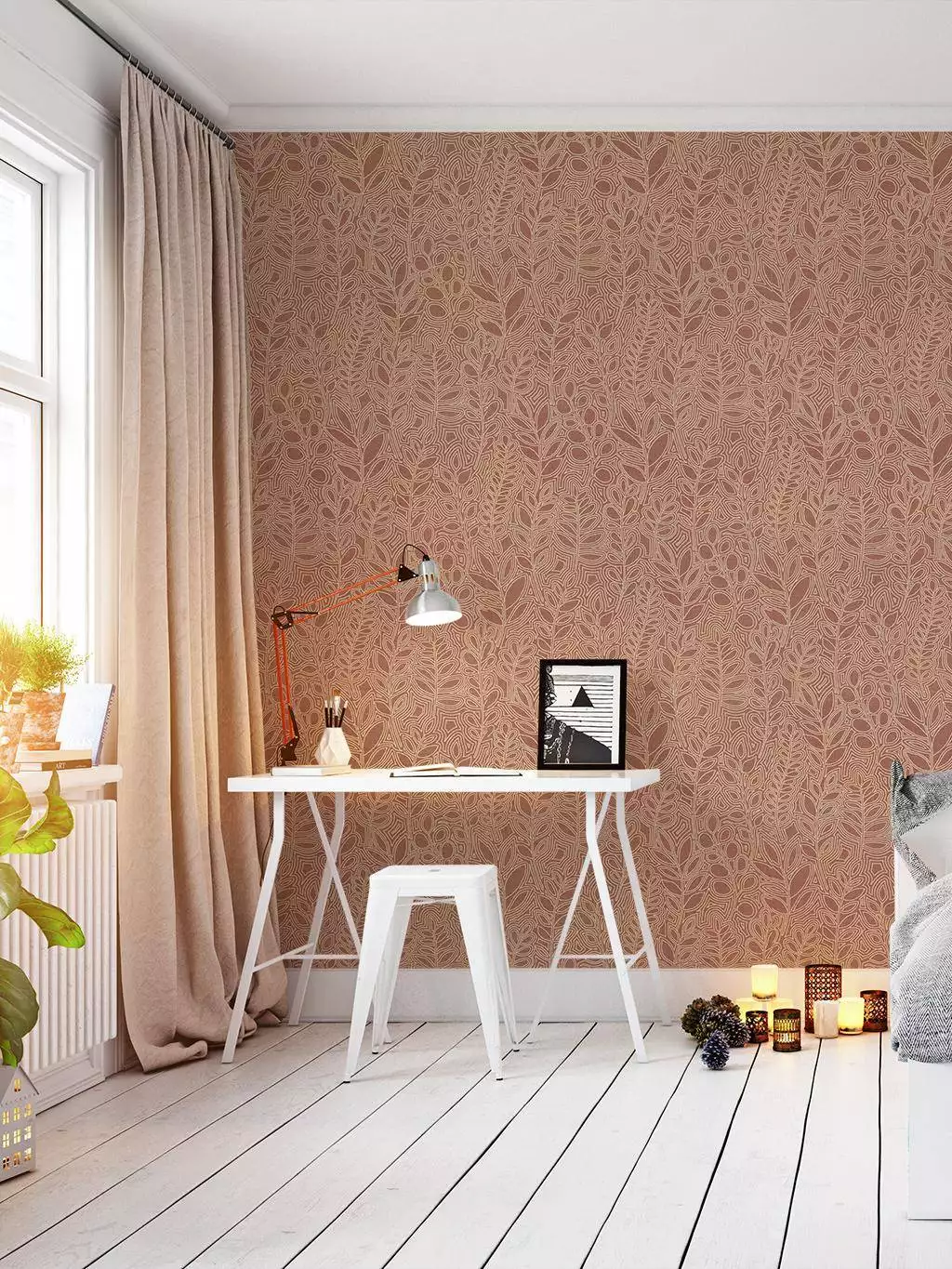 Die Tapete Astragale Terracotta ist inspiriert vom Astragalus, auch Milchkraut genannt, das auf den Barlearen als Wildgewächs zu finden ist. Seine gefiederten Blätter inspirierten die geprägten Silhouetten dieser Tapete. Auf leinenähnlichem Grund wirken sie wie feine Stickerei im mallorquinischen Stil – natürlich, strukturiert, freundlich zeitlos.