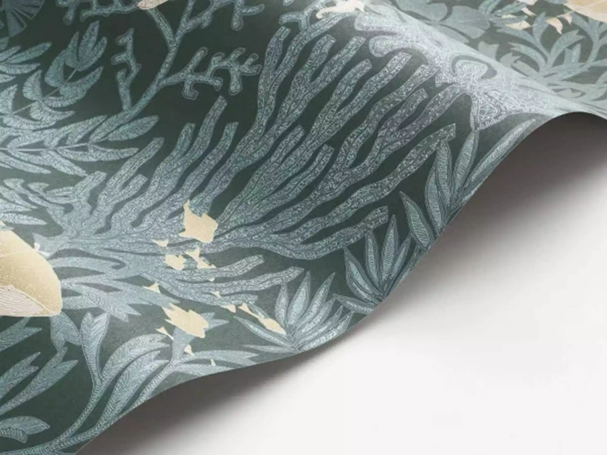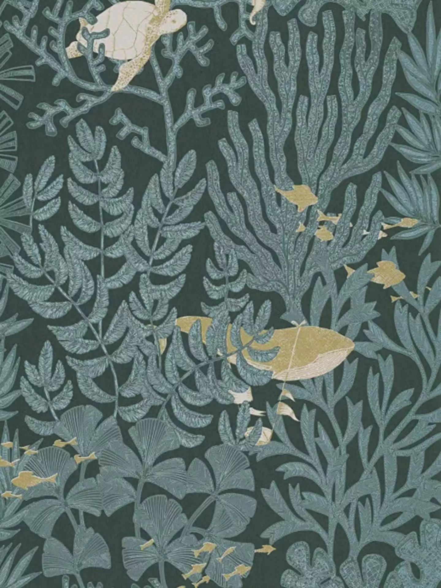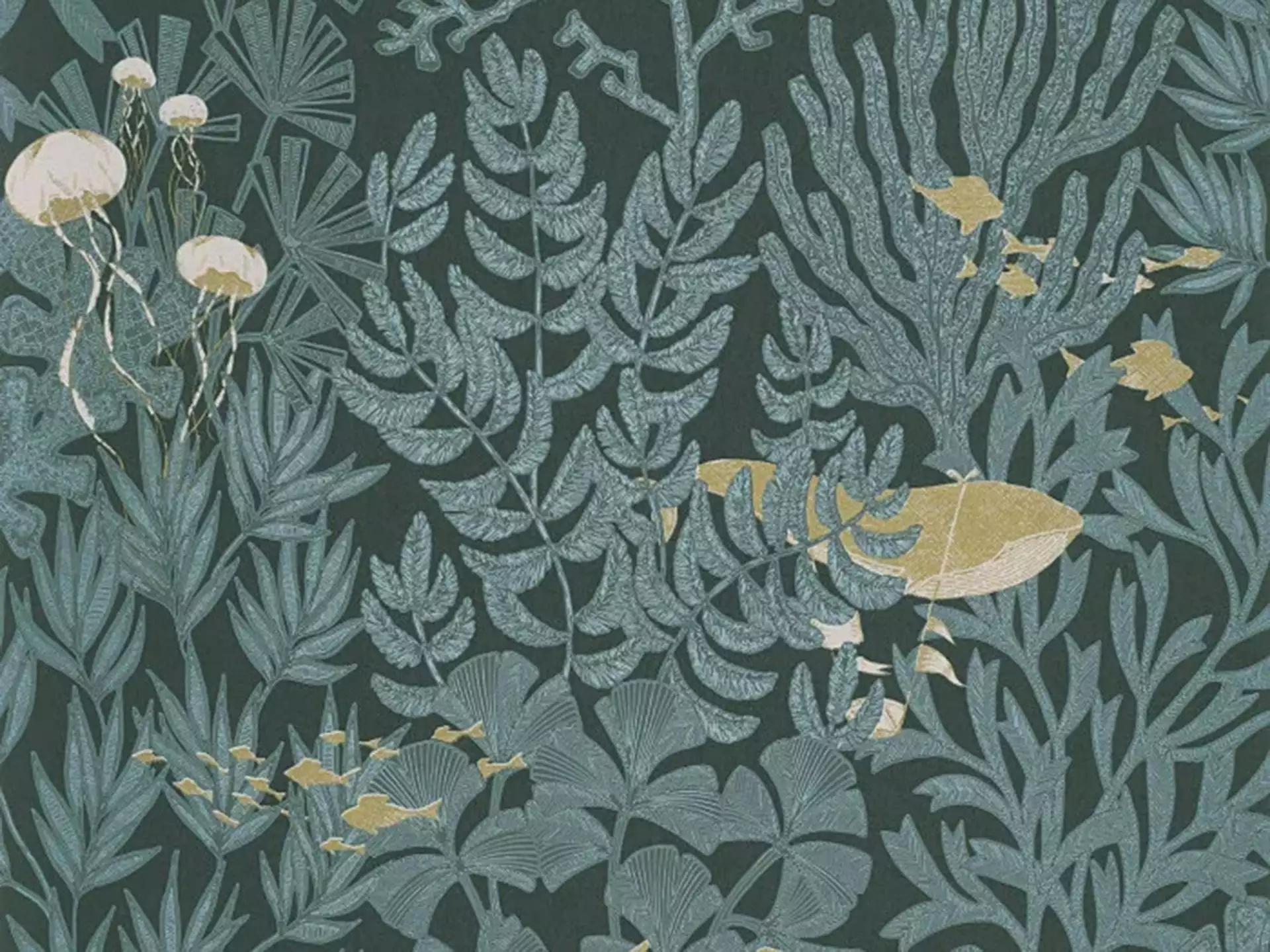 Die Tapete Atlantide entfaltet in der Farbgebung Vert/Kelp eine pittoreske, dichte Unterwasserlandschaft in satten Petrol-Grün-Tönen. Blätter und Korallen schweben in sanften Nuancen vor dem Font, goldene Fische, Seepferdchen und Quallen setzen lebendige Akzente und verleihen der Szenerie Tiefe und einen fast schimmernden Glanz – wie ein Blick in ein geheimnisvolles Aquarium.