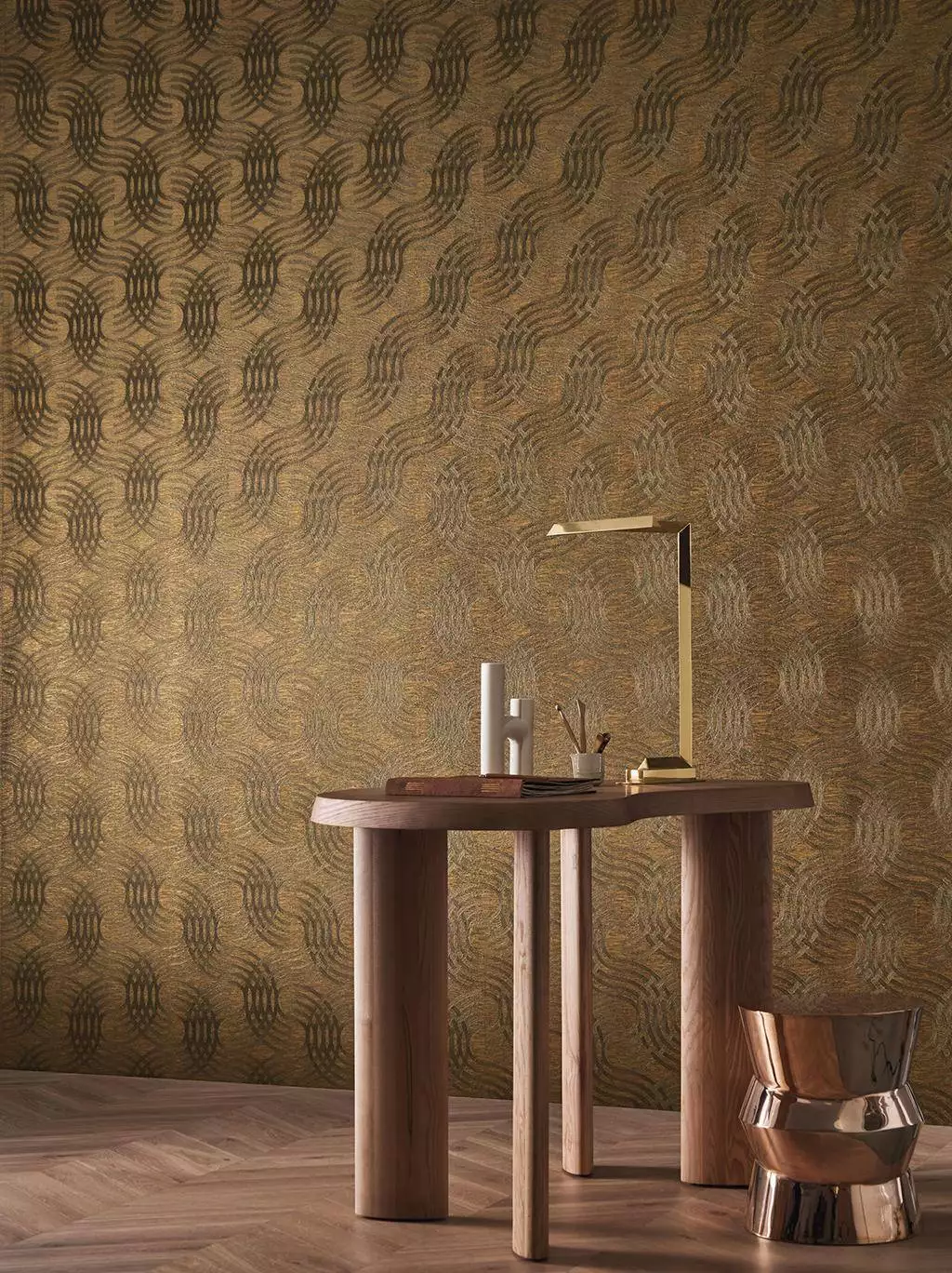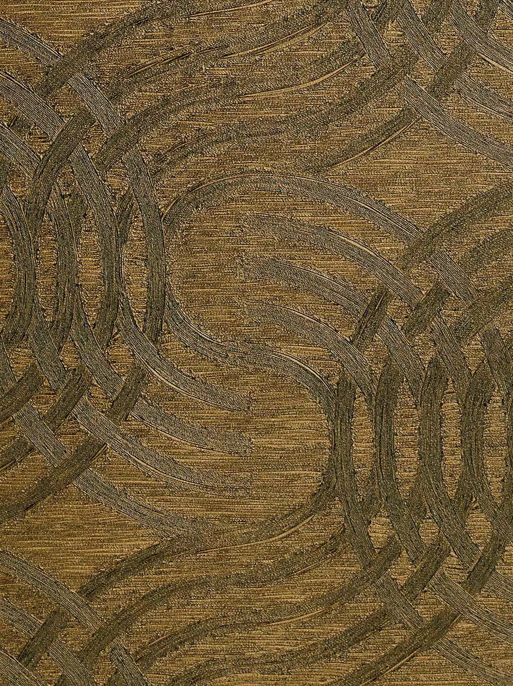 Die Tapete Auraria col. 50 in Schwarz / Gold entfaltet Ornamente in warmem Gold und Braun mit feinen Metalleffekten. Die Farbgebung erinnert an patinierte Bronze und verleiht der Wand Tiefe und Wärme. Je nach Licht zeigt die Oberfläche ein lebendiges Spiel aus Glanz und matt schimmernder Struktur. Lichtreflexe lassen die Oberfläche lebendig wirken. Diese Tapete wirkt wie ein Schmuckstück, das dem Raum Persönlichkeit verleiht. Von Omexco, aus der Kollektion Textures Métalliques.