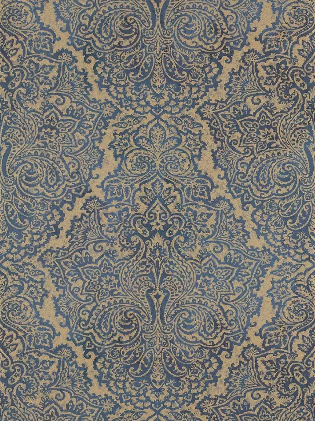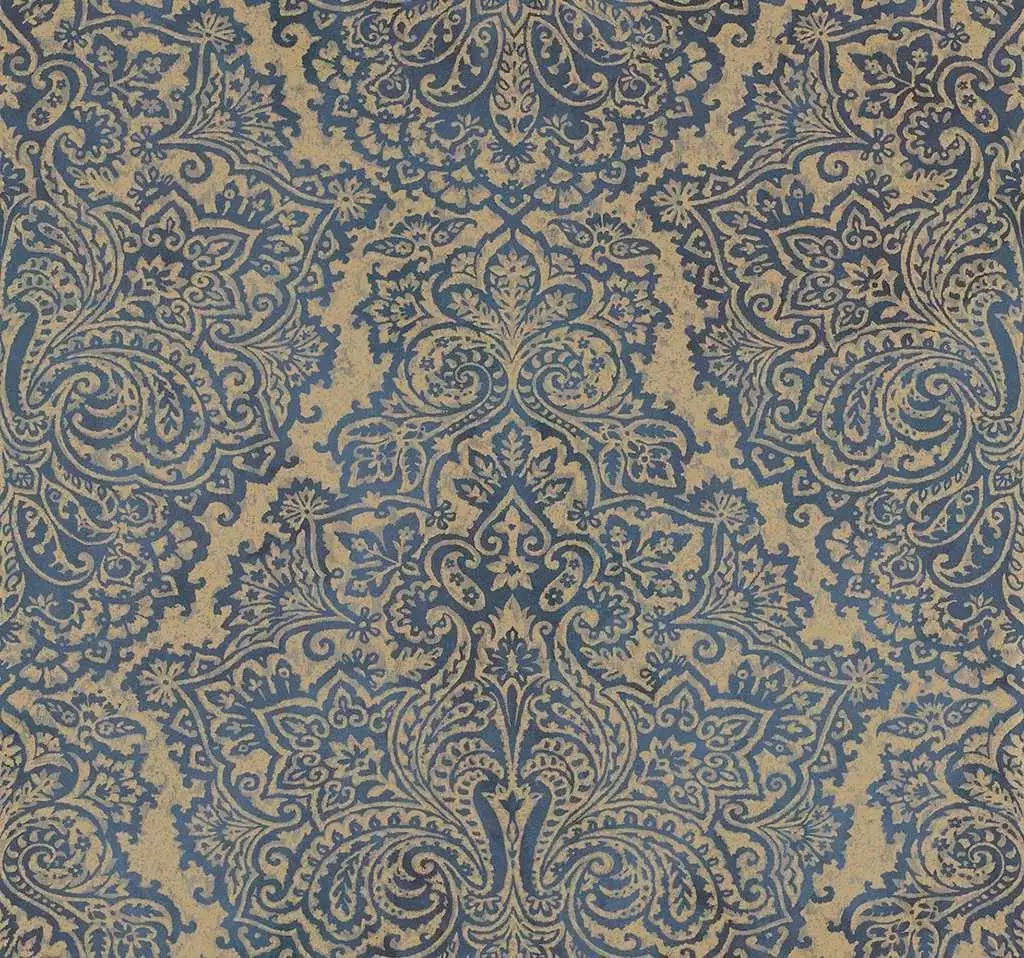 Die Tapete „Aurelia, col.42“ zeigt ein symmetrisches, orientalisches Muster mit floralen und paisleyähnlichen Formen in Gold und Blau. Das Design wirkt texturiert und verleiht einen edlen, klassischen Charakter.