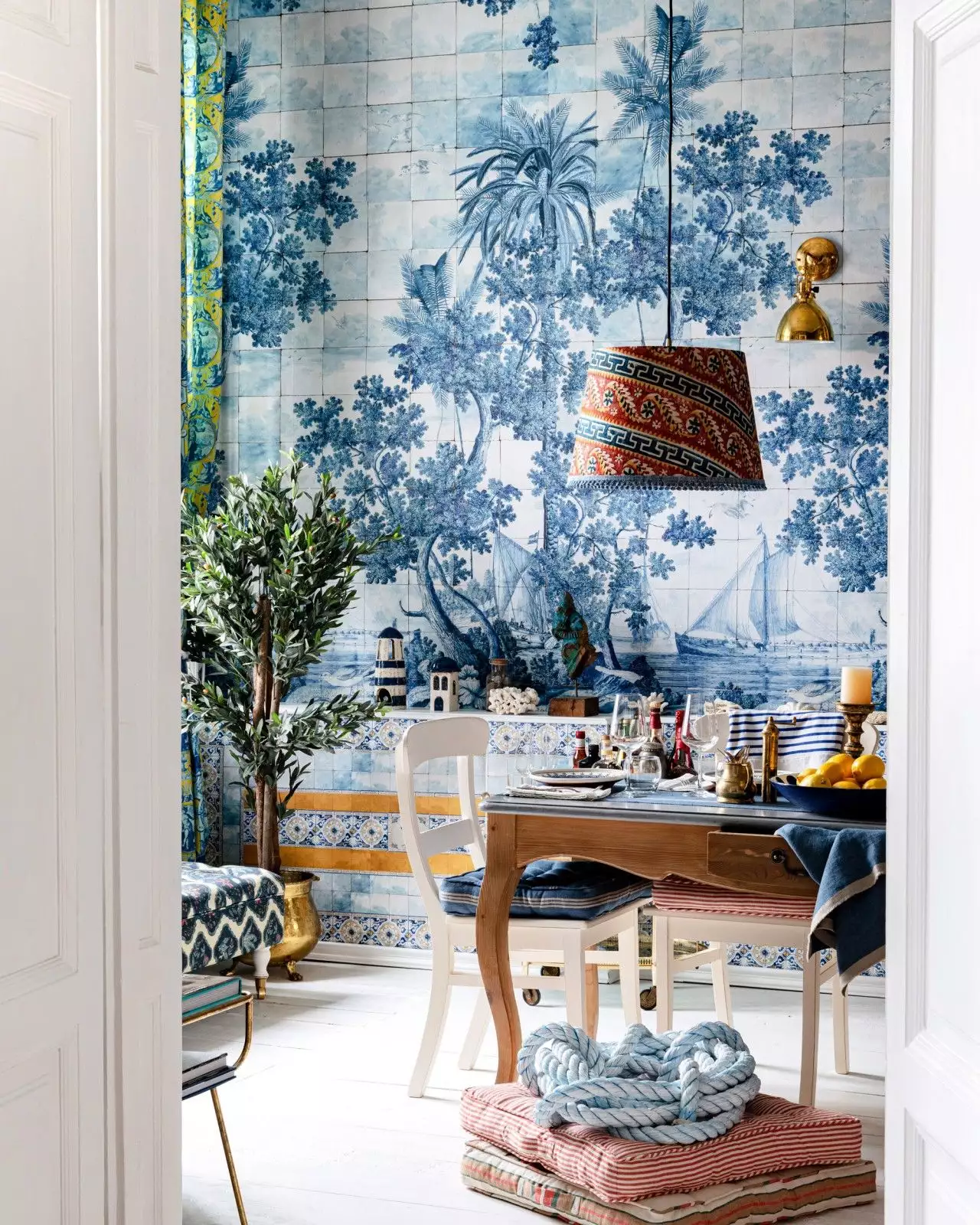 Eine gelassene Stimmung weht durch dieses sorgfältig detaillierte Kunstwerk, das in makellosem Blau gemalt ist. Inspiriert von alten handgefertigten mediterranen Kacheln, stellt die Wandtapete AZURE den Hintergrund eines paradiesischen Sommerhauses dar, das in helle Cyan-Blau-Töne gehüllt ist. Eine faszinierende Wandbekleidung voller lebendiger Details, die einen malerischen Blick auf die Mittelmeerküste irgendwo in Frankreich zeigt.