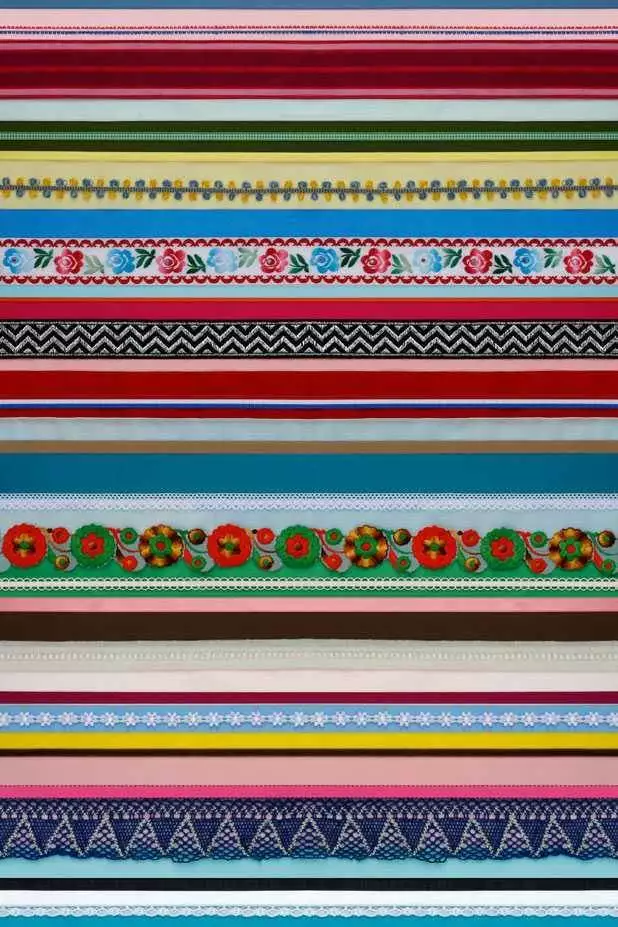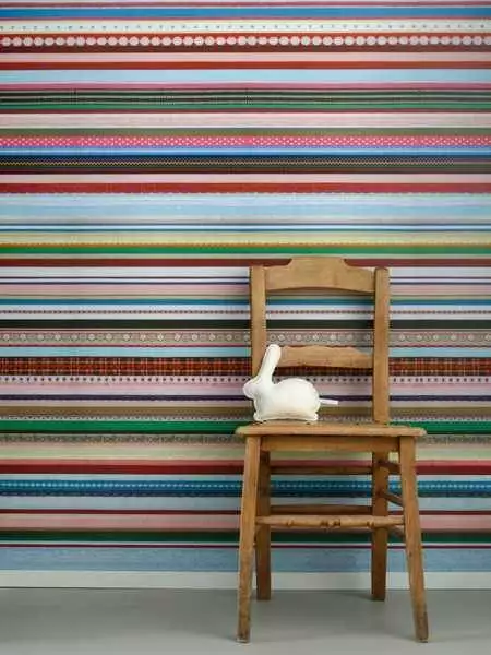 Authentische Zierstreifen, Spitzen und Bänder aus Omas Nähkästchen zieren diese fröhliche Tapete. Ein Clou von Studio Ditte.