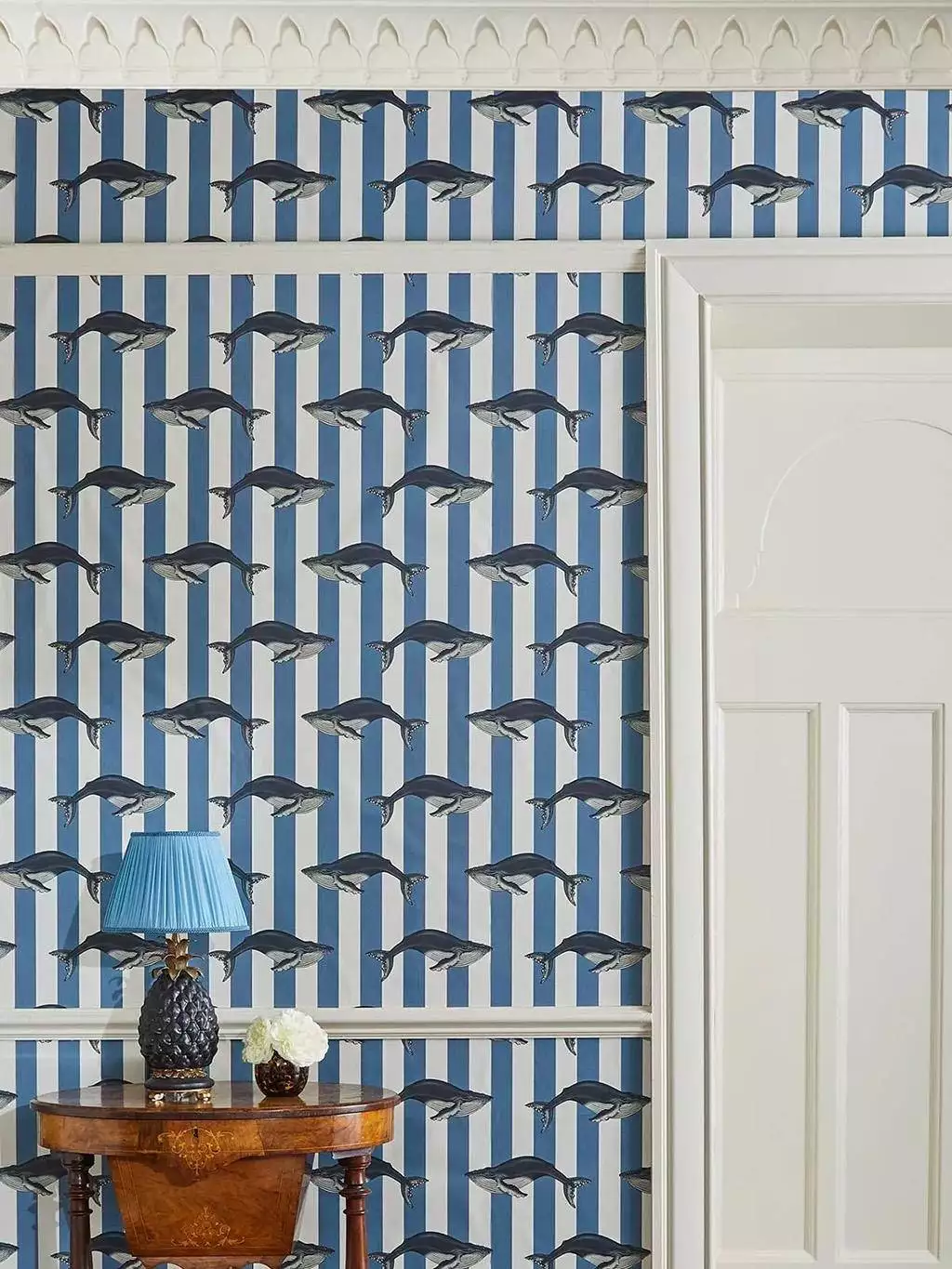 Kräftige Streifen in Blau und Creme, dazwischen detailreiche Wale, das ist die Tapete Baleana von House of Hackney. Mit Illustrationen von Grönlandwalen vor einem gestreiften Hintergrund gibt diese blau-cremefarbene Designtapete der Wand eine ausgeglichene Balance zwischen Verspieltheit und Ruhe.