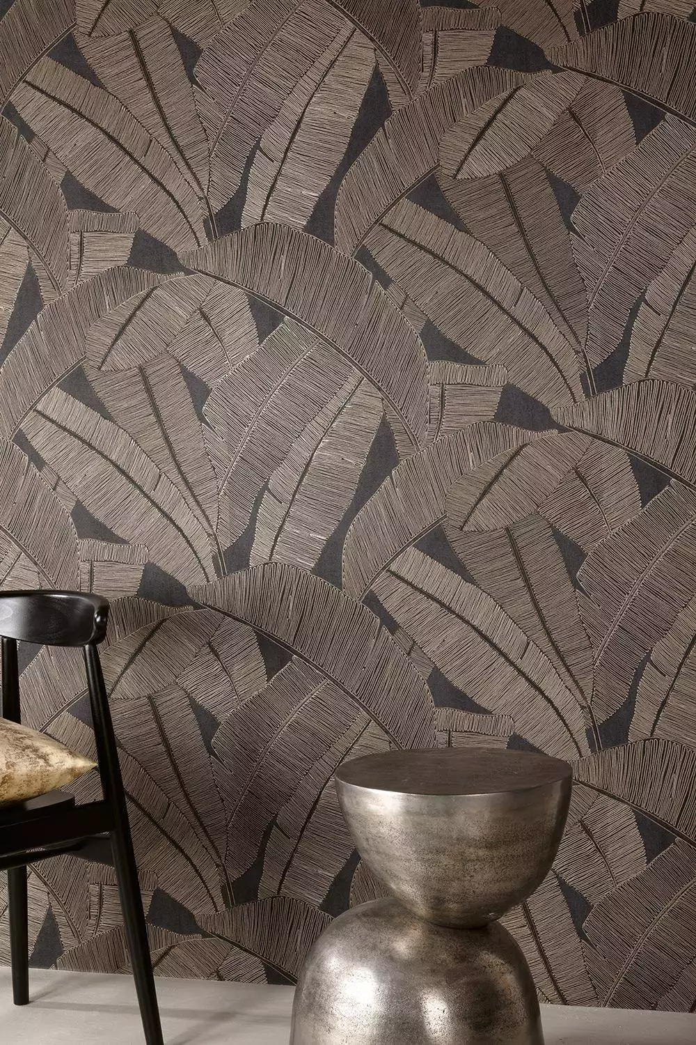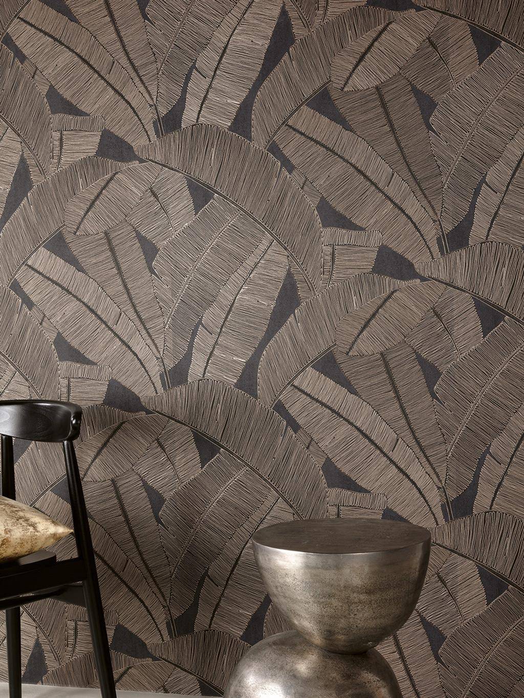 Beeindruckend erweckt die Tapete Banyan Coffee tropisches Blattwerk vor dunklem Fond zu üppigem Leben. Die reliefartige, schimmernde Prägung lässt jedes Blatt plastisch hervortreten; der dunkle Fond bietet dabei die perfekte Bühne, um Tiefe, Spannung und dezente Dramatik entstehen zu lassen. Licht bricht in den erhabenen Strukturen wie auf gewebtem Brokat. Das Design Banyan ist eine Hommage an die ungezähmte Schönheit des wilden Indiens, und sein Name ist dem heiligen, ikonischen Lebensbaum entliehen. So, wie der Baum Schatten, Schutz und Zuflucht spendet, strahlt dieses Design eine ruhige Kraft aus. Eines unserer Lieblingsstücke. Die Haptik des Materials ist bemerkenswert.