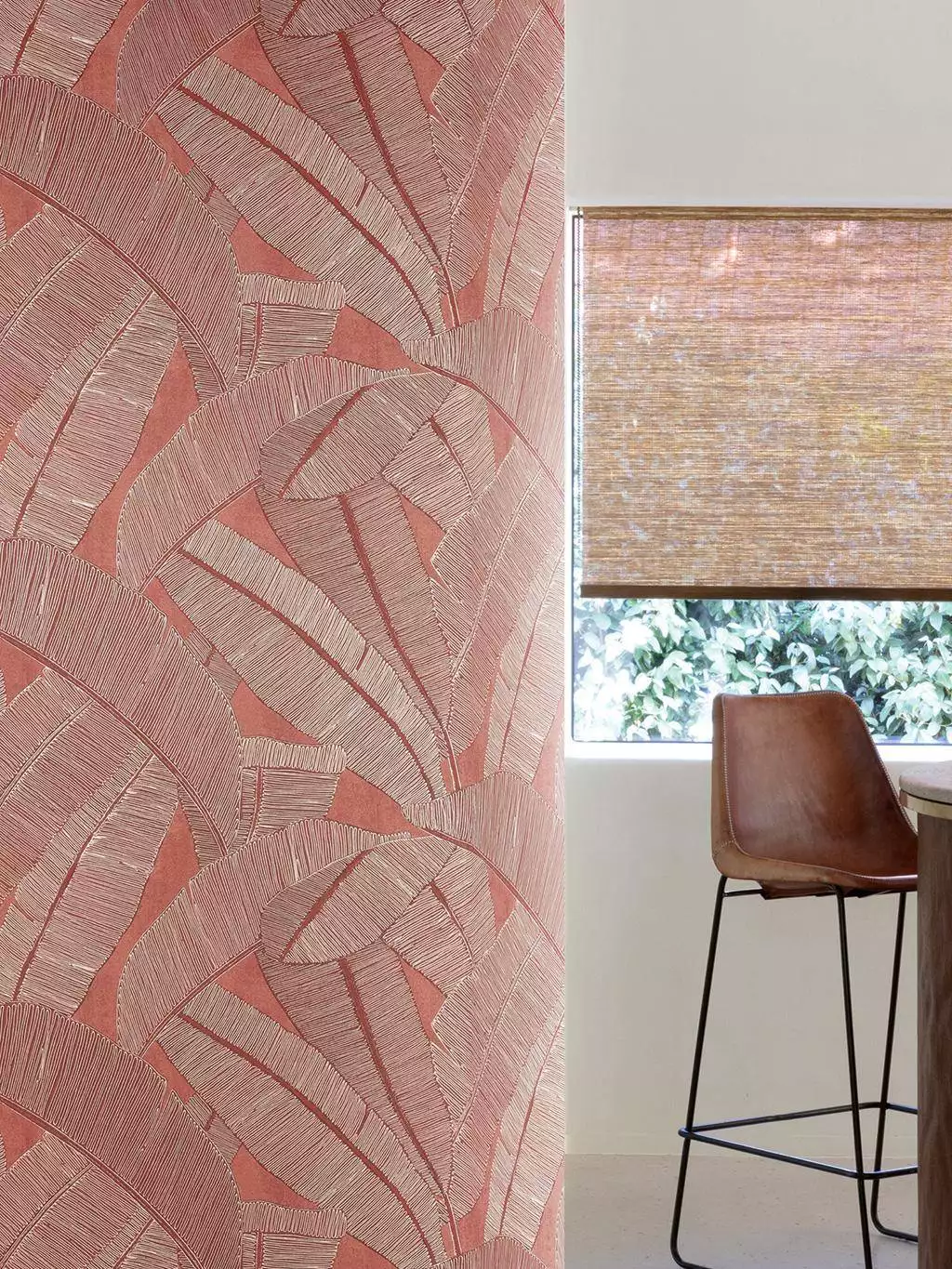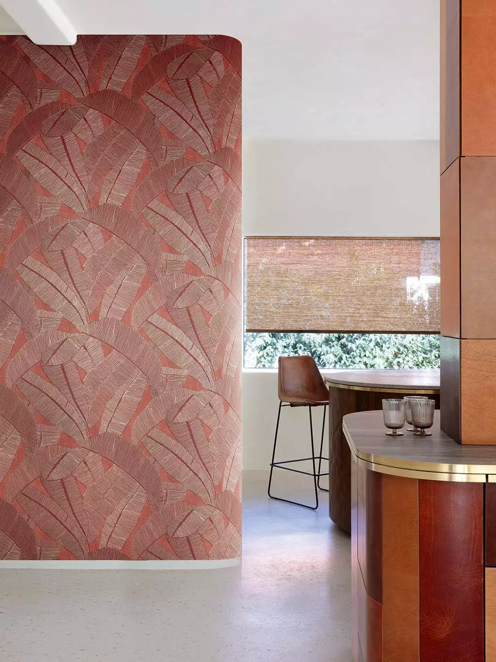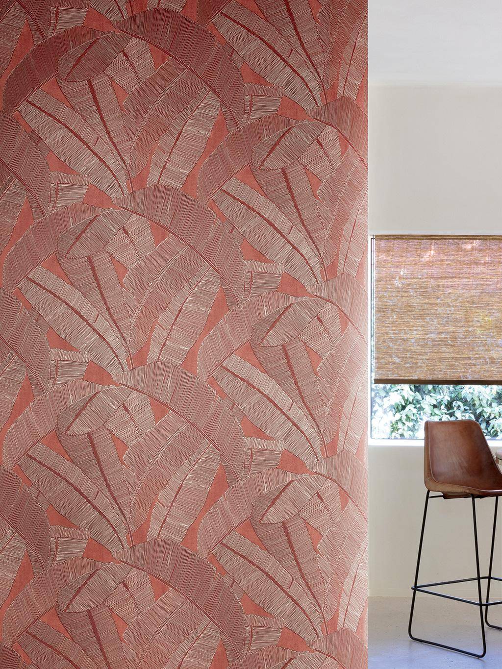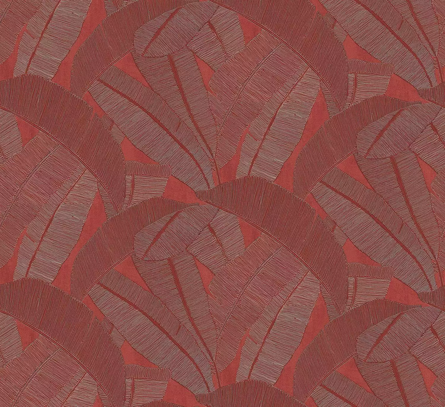 Banyan Amberglow - der Name ist Programm. Diese Designtapete aus der Kollektion Serica ( = Seide) erweckt kräftiges tropisches Blattwerk vor einem feurigen, einfarbigen Hintergrund zum Leben. Jedes Blatt ist reliefartig geprägt. Ein unendlich laufender, heller Faden, der das Design bildet, fängt Licht auf spektakuläre Weise ein wie Seidenbrokat. Das Motiv erinnert an die ungezähmte Schönheit der indischen Wildnis; der Name der Tapete wiederum ehrt den Banyan Baum, Indiens heiligen, ikonischen Lebensbaum. So, wie der Banynan Schatten, Energie und Ruhe spendet, strahlt dieses Design unendliche Kraft und Schutz aus. Die Haptik des Materials ist bemerkenswert.