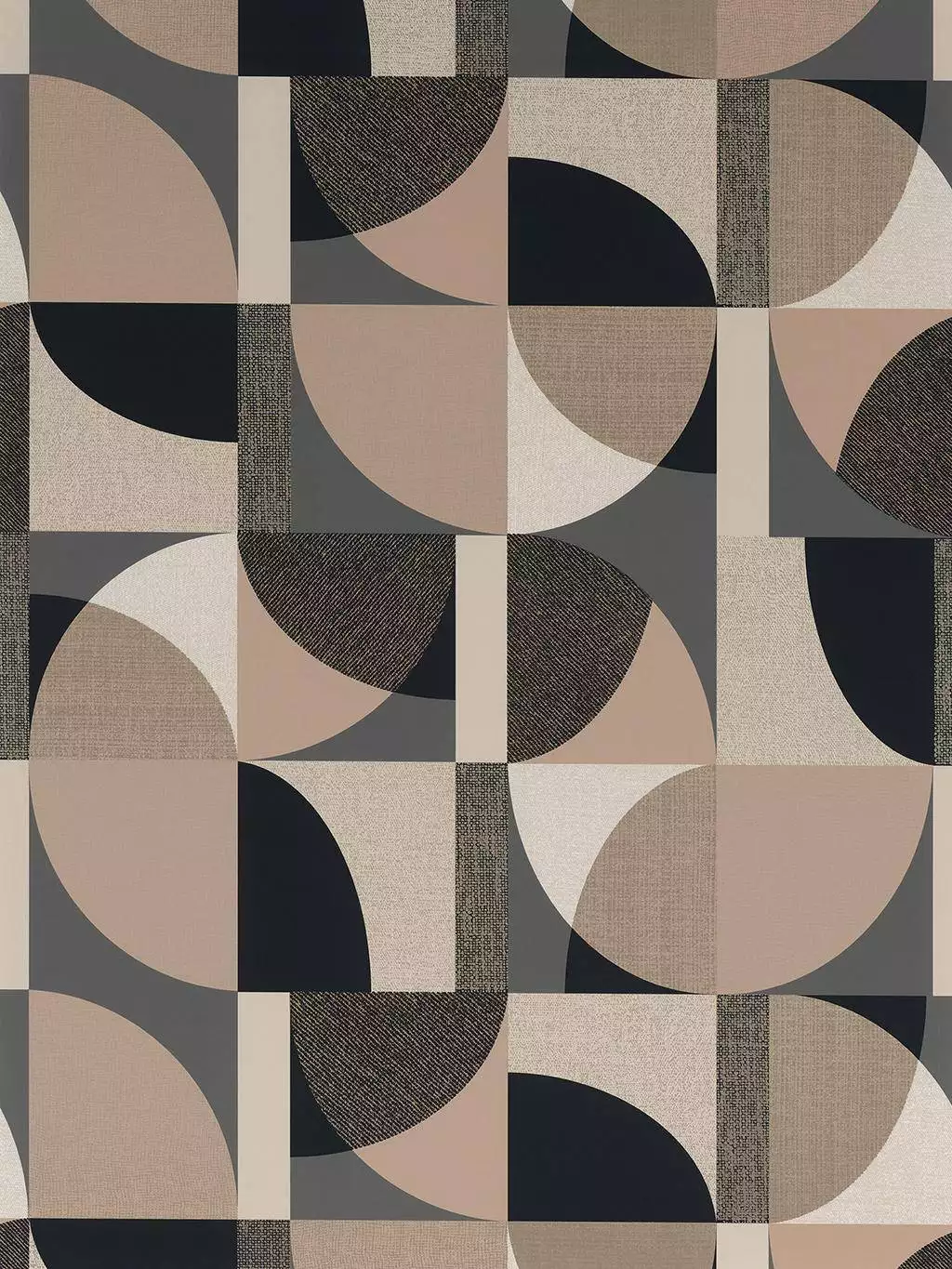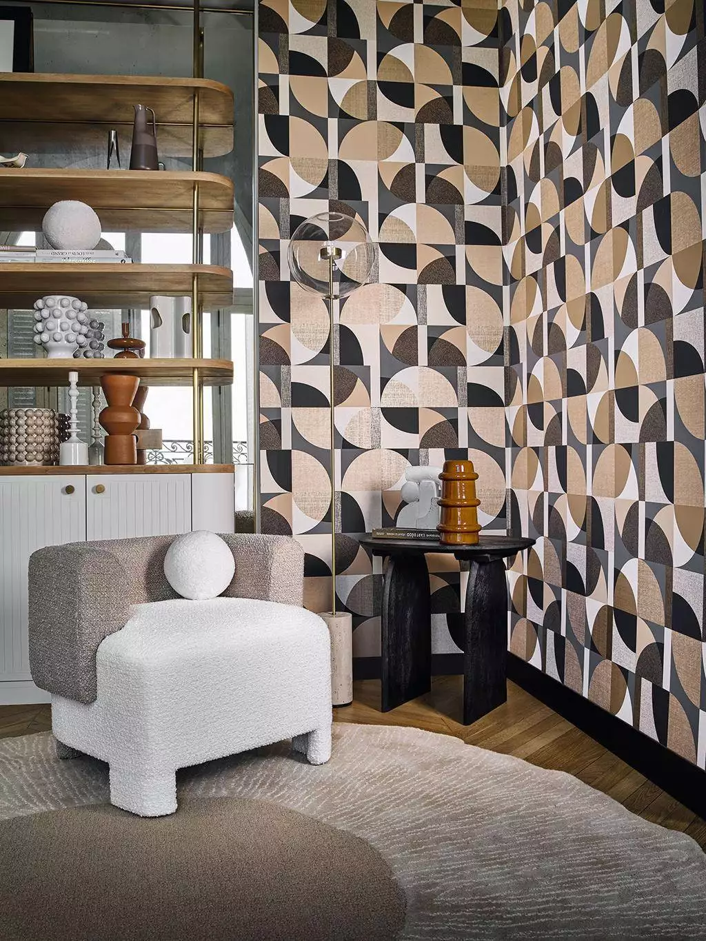 Geometrische Formen in Anthrazit, Creme, Gold und Grau bilden bei Barillet, col.14 ein spannungsreiches Spiel aus Halbkreisen und Flächen. Das Muster erinnert an die klaren Linien des Art Déco und lebt von der strengen Ordnung ebenso wie von der Bewegung, die durch die Kreissegmente entsteht. Die Farbgebung verleiht der Tapete Tiefe und Eleganz, während die Flächenstruktur einen feinen textilen Charakter andeutet.