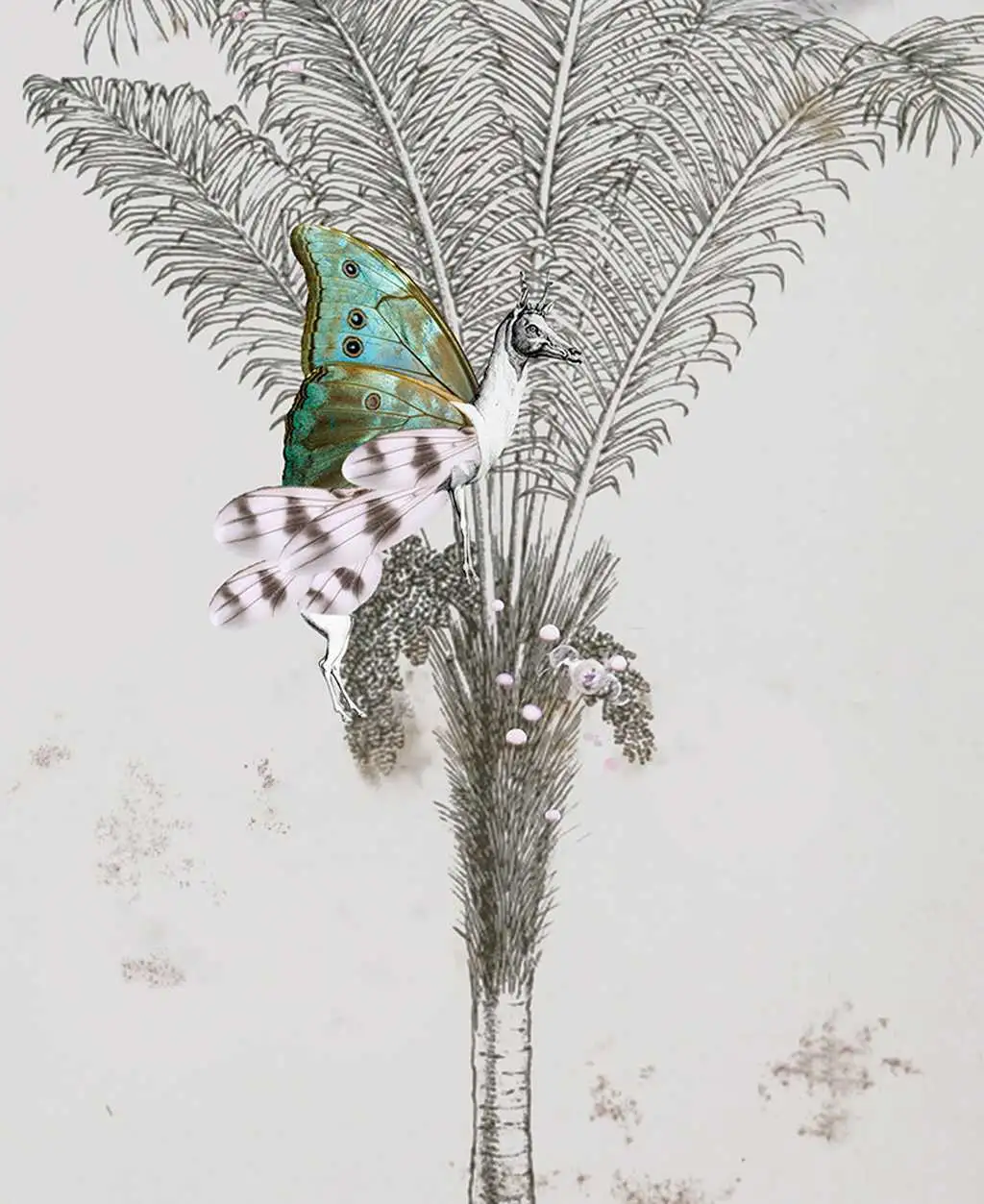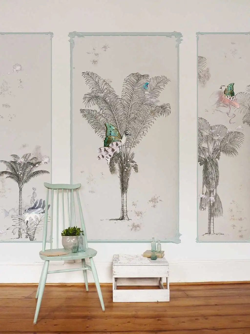 Diese Tapete besteht aus fünf Paneelen, die zusammen eine imposante Wandmalerei von 2,60 Metern Breite und 3,00 Metern Höhe bilden. Das Design ist auf Vliespapier gedruckt, was für seine Langlebigkeit und einfache Handhabung bekannt ist. Die Verwendung von Mica in der Herstellung verleiht der Tapete einen subtilen, schimmernden Effekt, der die Illustrationen zum Leben erweckt. Die dominierenden Farben sind sanfte Grautöne und Weiß, akzentuiert durch mehrfarbige Schmetterlinge und Pflanzenmotive, die eine ruhige und dennoch lebendige Atmosphäre schaffen.