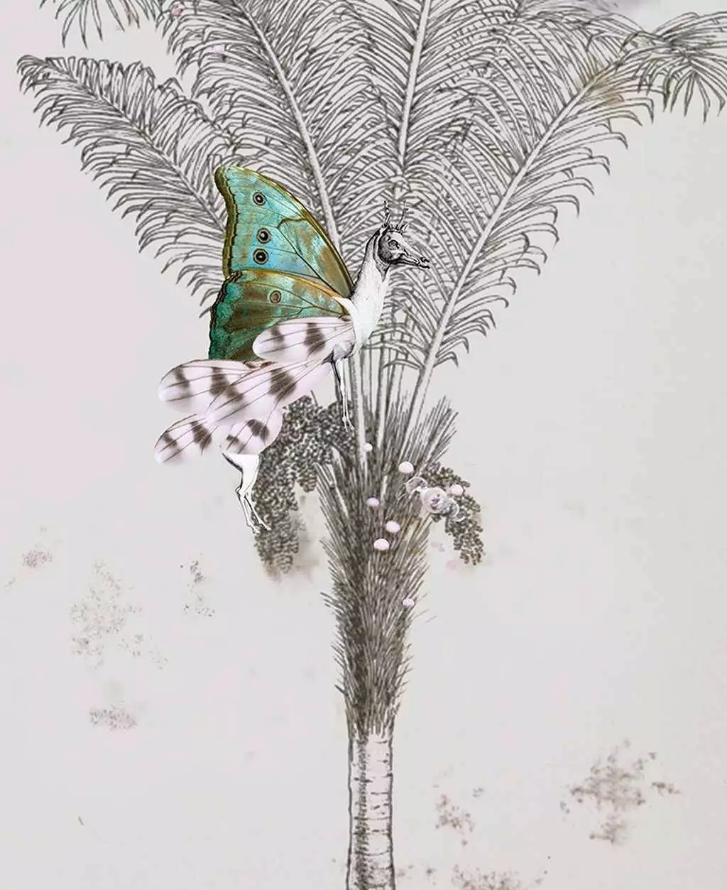 Diese Tapete besteht aus fünf Paneelen, die zusammen eine imposante Wandmalerei von 2,60 Metern Breite und 3,00 Metern Höhe bilden. Das Design ist auf Vliespapier gedruckt, was für seine Langlebigkeit und einfache Handhabung bekannt ist. Die Verwendung von Mica in der Herstellung verleiht der Tapete einen subtilen, schimmernden Effekt, der die Illustrationen zum Leben erweckt. Die dominierenden Farben sind sanfte Grautöne und Weiß, akzentuiert durch mehrfarbige Schmetterlinge und Pflanzenmotive, die eine ruhige und dennoch lebendige Atmosphäre schaffen.