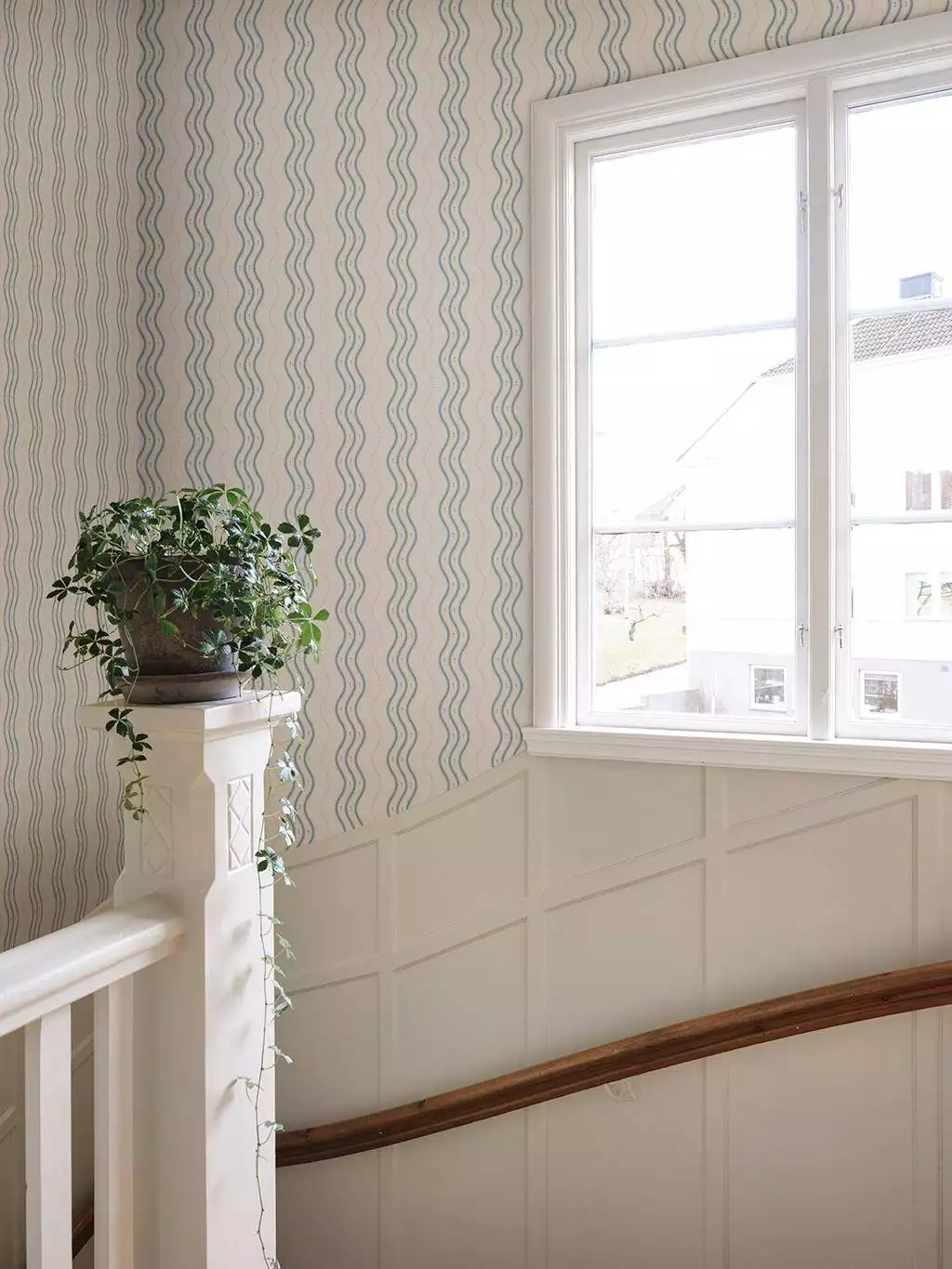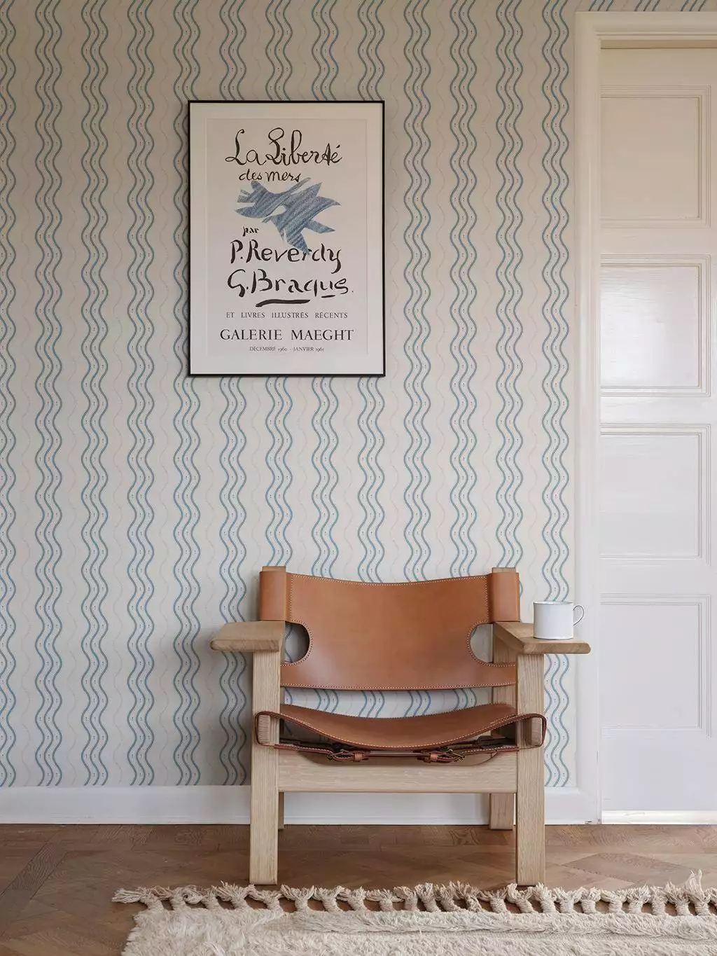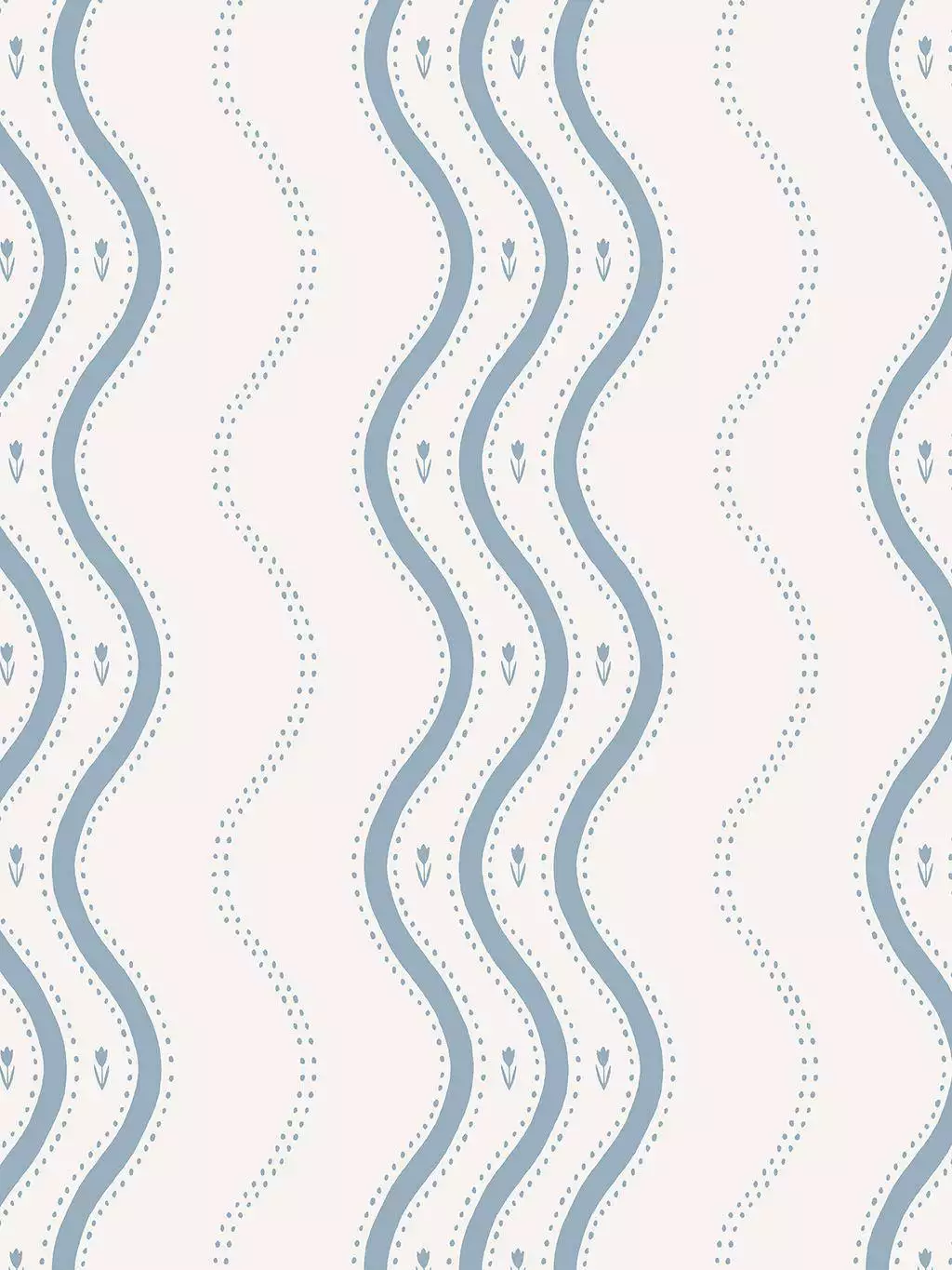 Die Streifentapete Ben Red setzt auf verspielte, wellenförmige Streifen in einem hellem Blau auf Off-White farbenem Hintergrund. Abgerundet wird das Design durch feine, in den Wellenbewegungen mitfließende Punktdetails und winzige Krokusblumen – ein subtil humorvoller Twist für die Wand, leicht, lebendig und stilvoll. Auch in Red erhältlich.