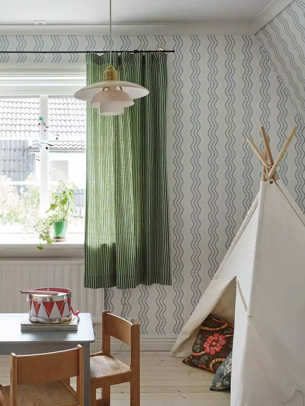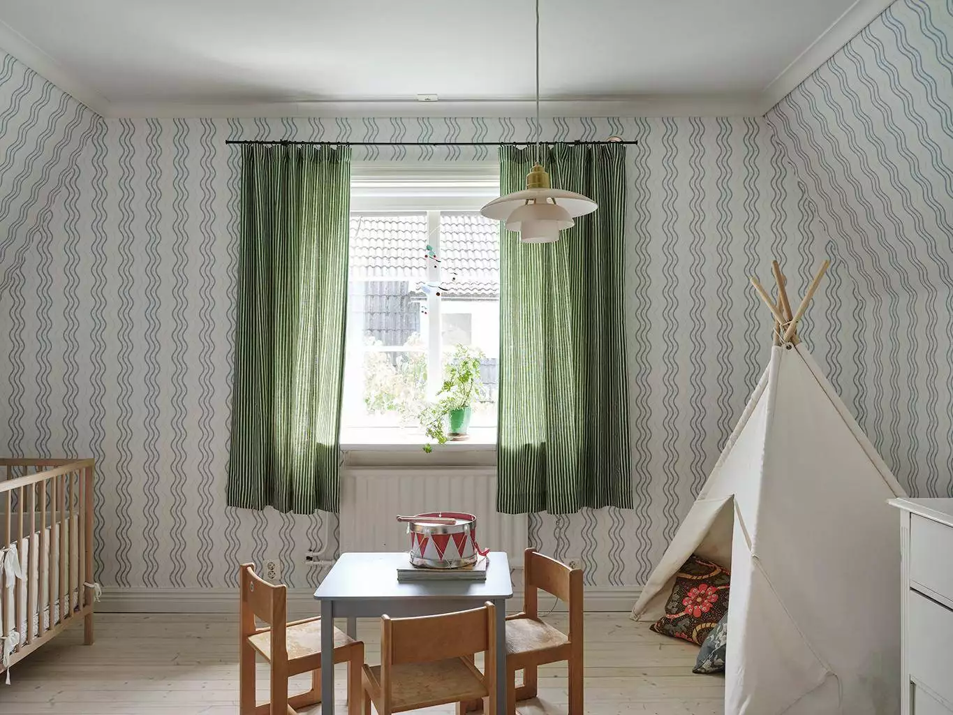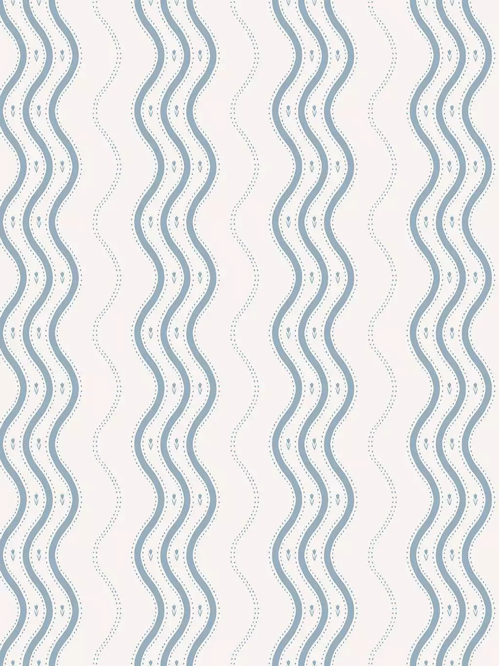 Die Streifentapete Ben Red setzt auf verspielte, wellenförmige Streifen in einem hellem Blau auf Off-White farbenem Hintergrund. Abgerundet wird das Design durch feine, in den Wellenbewegungen mitfließende Punktdetails und winzige Krokusblumen – ein subtil humorvoller Twist für die Wand, leicht, lebendig und stilvoll. Auch in Red erhältlich.