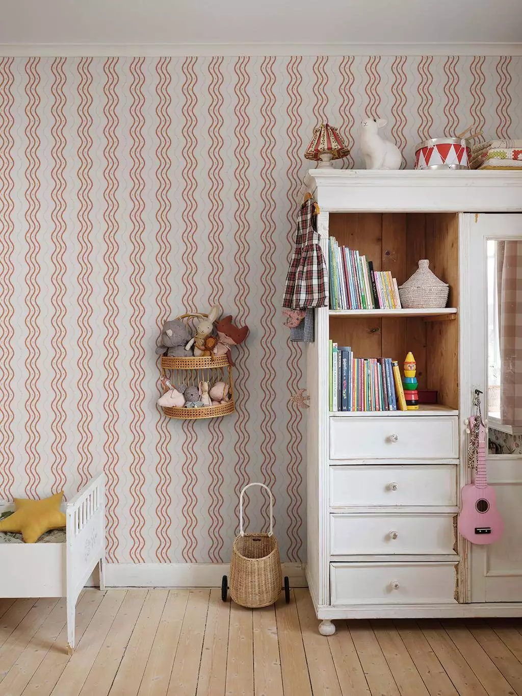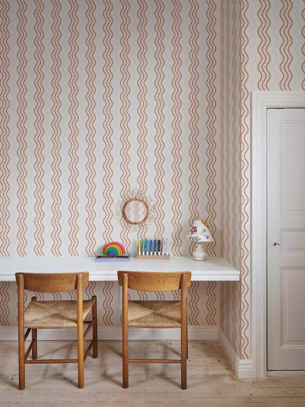 Die Streifentapete Ben Red setzt auf verspielte, wellenförmige Streifen in einem warmen Rot auf Off-White farbenem Hintergrund. Abgerundet wird das Design durch feine, in den Wellenbewegungen mitfließende Punktdetails und winzige Krokusblumen – ein subtil humorvoller Twist für die Wand, leicht, lebendig und stilvoll. Auch in Light Blue erhältlich.