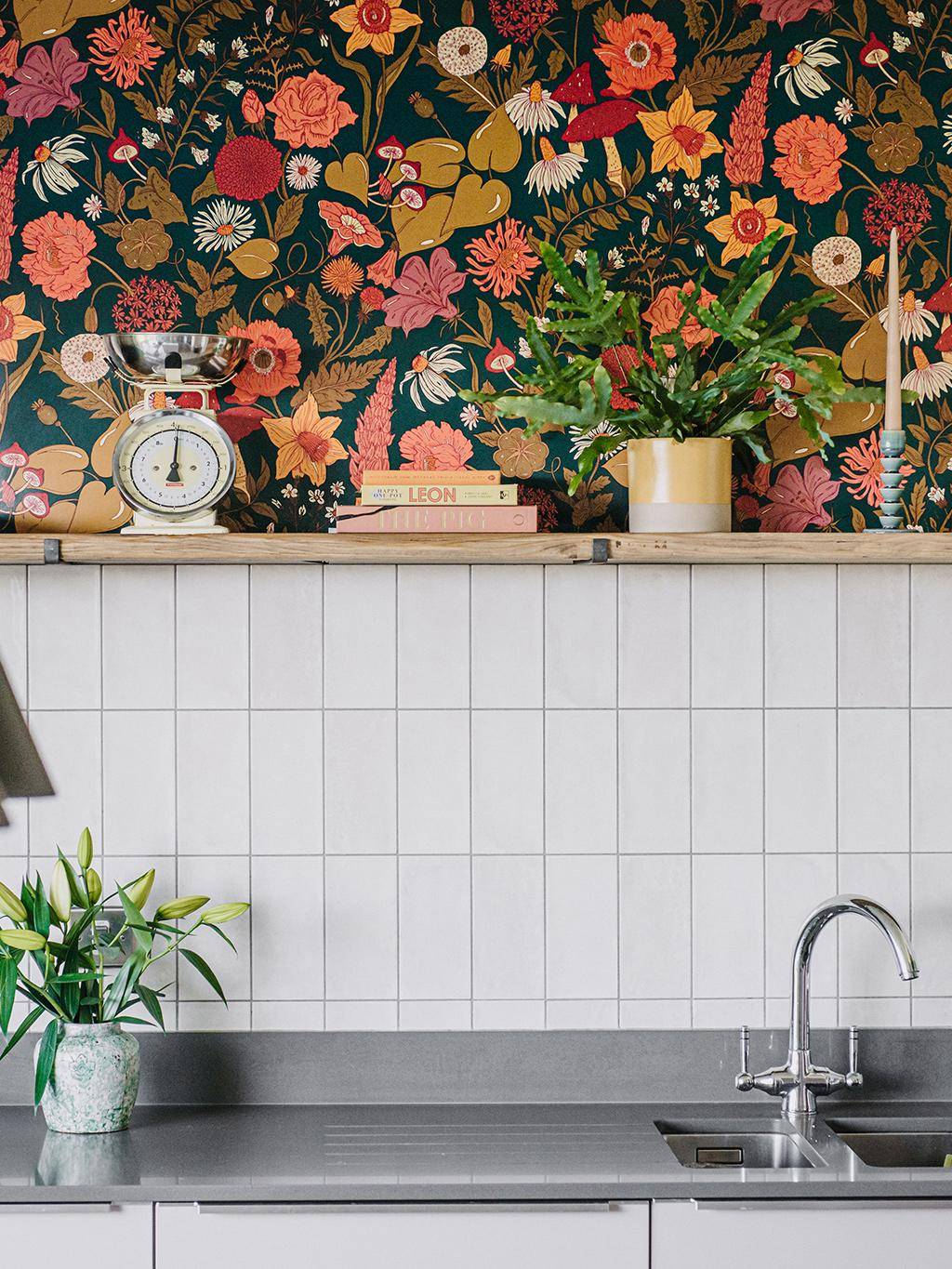 Bloom Tapete in Autumn Teal. Bloom, eine Blume, die speziell für ihre Schönheit gezüchtet wird. Dieses illustrative Design zeigt ein Gewirr von übergroßen, frischen Wildblumen, die an Märchenbücher aus der Kindheit erinnern. Bloom zeigt Pfingstrosen, Rosen und Gänseblümchen und versprüht einen Hauch von Verzauberung und Wunder. Diese reiche und tiefe Palette an frischem Grün ist kühn und kraftvoll und sitzt mühelos auf einem von der Natur inspirierten tiefen Teal.