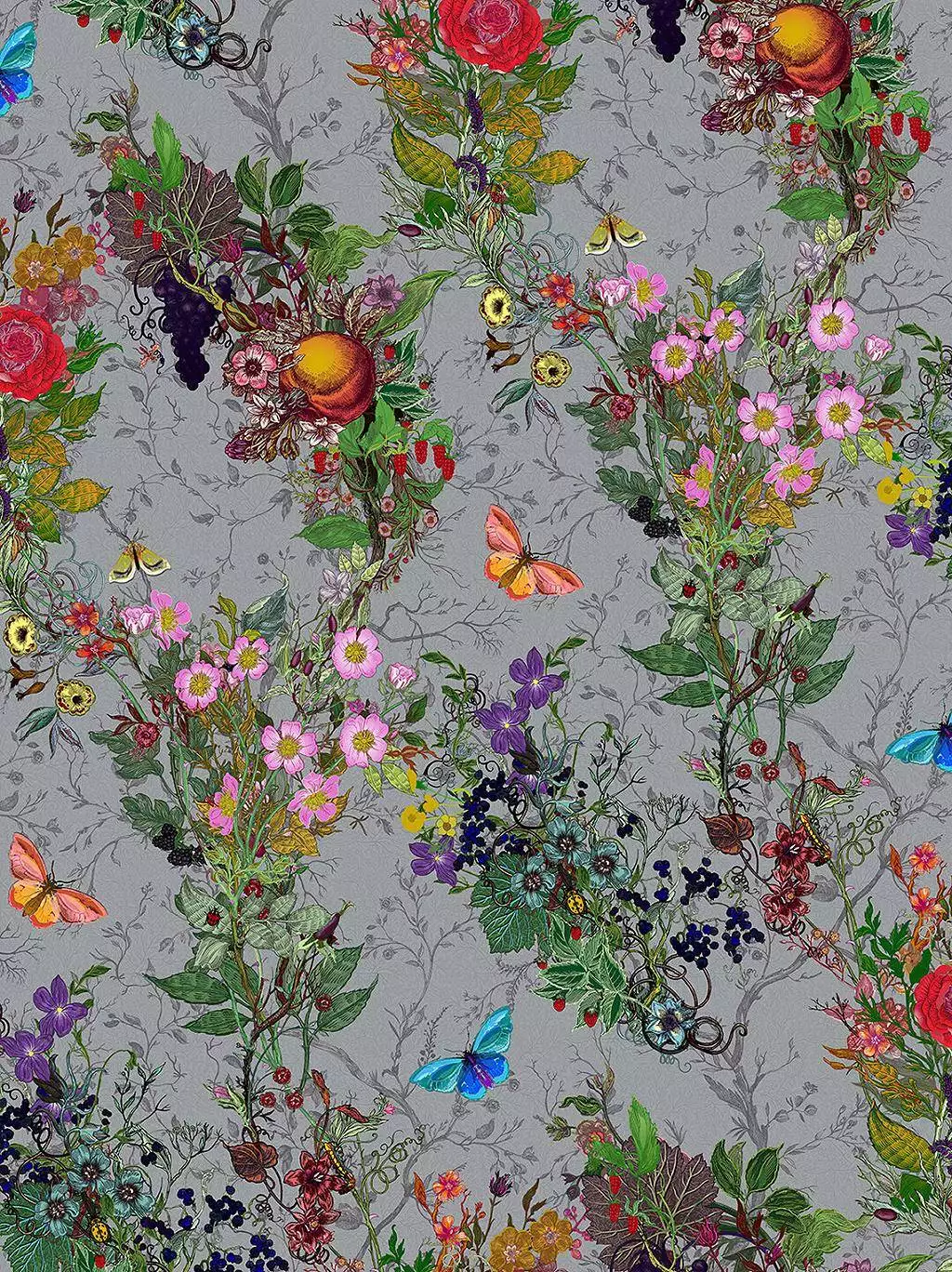 Die "Bloomsbury Garden Wallpaper 2" von Timorous Beasties ist eine lebendige Hommage an die Pracht eines wilden Gartens. Üppige Blüten, Früchte, Schmetterlinge und Blätter vereinen sich auf einem subtilen grauen Hintergrund zu einem dynamischen, detailreichen Muster. Die kräftigen Farben der floralen Elemente schaffen einen beeindruckenden Kontrast, der den Raum zum Leben erweckt.