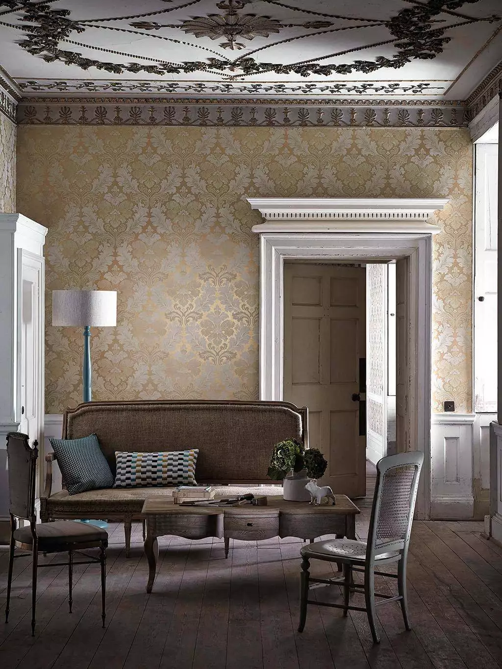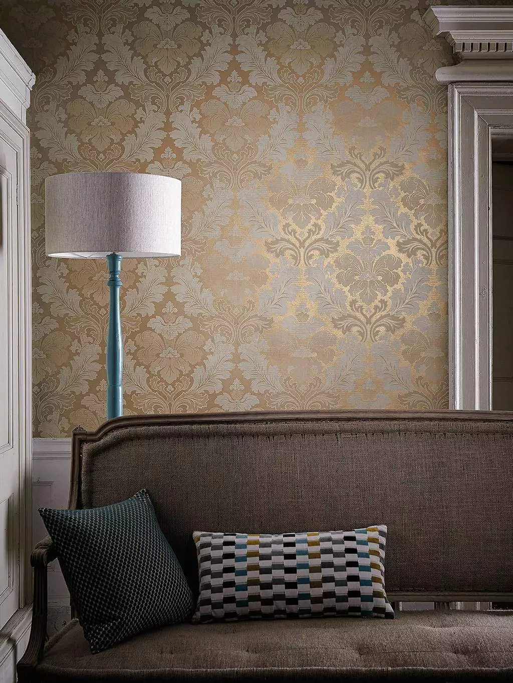 Die Tapete Bonaparte, eine Überarbeitung eines authentischen französischen Damast aus dem 19 Jahrhundert, wurde kürzlich als lackiertes Kunstwerk in einer Atelierwohnung in Paris gefunden. Es ist ein verbreitetes Missverständnis, dass die in historischen Dekorationen verwendeten Farben ausschließlich düster waren. Die hier reproduzierten satten Farbtöne, -schichten und -abstufungen stimmen genau mit den Originaltapeten überein und sorgen doch für eine sehr moderne Wohnatmosphäre. Ein Design von etwa 1850.