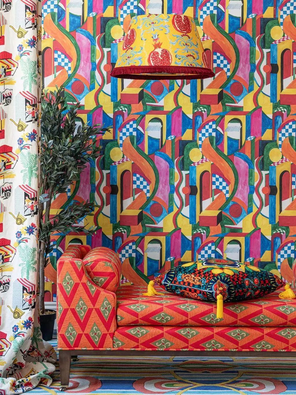 Die kräftigen Farben – Rot, Blau, Gelb und Grün – sind perfekt aufeinander abgestimmt und verleihen jedem Raum eine positive und einladende Ausstrahlung. Diese Tapete eignet sich besonders gut, um einen Akzent in einem ansonsten schlichten Raum zu setzen oder um einen gesamten Raum in ein kreatives und inspirierendes Umfeld zu verwandeln.