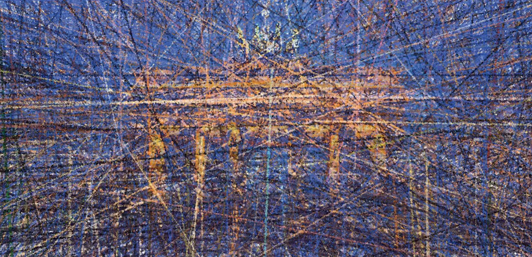 Vor dem Brandenburger Tor dudelte die Musik von Keith Emerson (03.2016 R.I.P) und den THE NICE von 1968 im Ohrstöpsel: Brandenburger. Emerson führte mich als Teen zur klassischen Musik, gerade auch an Bach heran. Die Brandenburger Konzerte hatten immer eine magische Wirkung auf mich. Vor allem, wenn man Potsdam, Sans Souci und Berlin besucht. So kam es, dass ich tanzende Linien (no problems ;-)) vor meinem Auge sah und so das "Tor" fotografierte. Die tanzenden Linien und Punkte sind nun eine illustrative Emotion dieses Ortes mit dieser Musik. Meine Liebe zur Typografie wollte es, auch eine altdeutsche Geschichtsversion des Gates nur mit Text zu gestalten. Eine erhebende Tapete.