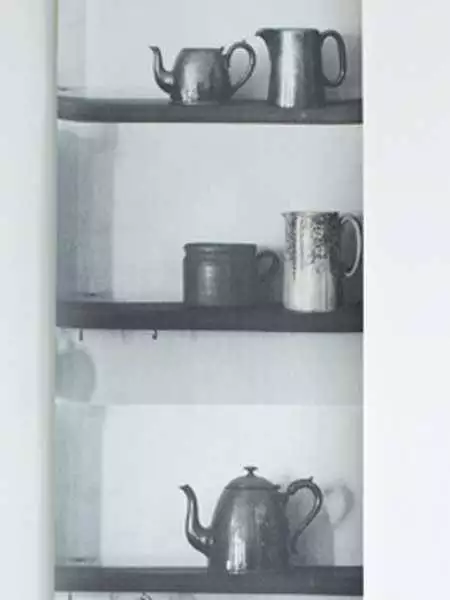 Maschinell bedruckte Tapete von Regalen mit französischer Keramik. Mit Siebdruck von Hand koloriert . Gedruckt, geschnitten und verpackt von Hand in England.