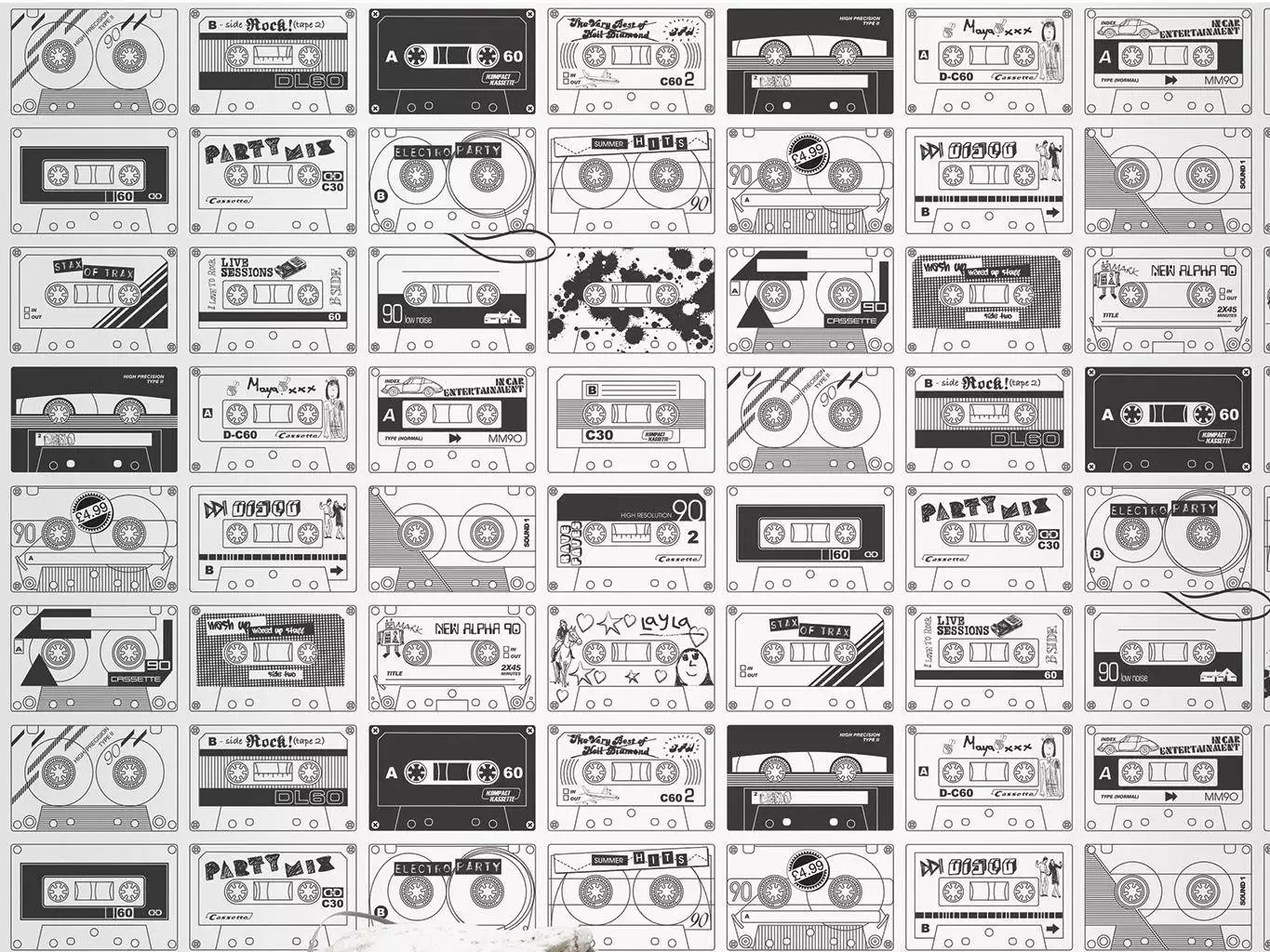 Diese Tapete ist das unkolorierte Do-It-Yourself Pendant zur Tapete C60, chalkboards, einer Hommage an zahllose Mixtapes, ohne die eine Jugend früher fast undenkbar war. Diese Tapete kann nach eigener Inspiration ausgemalt werden. Selbst aufgenommene Kassetten waren damals das Social Media, nur ehrlicher. Diese Tapete erzählt genau davon – von Stunden vor dem Recorder, von Musik und jugendlichen Träumen. Ihr Muster bringt das Gefühl von Jugendzimmern, Lieblingssongs und Sommernächten zurück und ist eine Hommage an all die Tapes, die wir als Teenager wie Schätze gehortet haben. Ein Design mit Persönlichkeit und einer Prise Retro-Nostalgie.