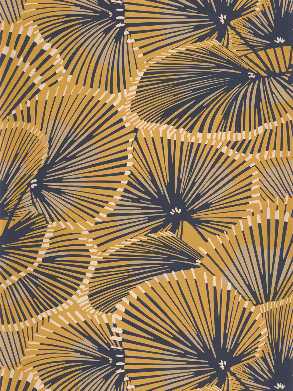 Cabaret, Jaune Mordoré zeigt ein dynamisches Spiel aus fächerartigen Formen, die sich wie Palmblätter aneinanderlegen. Goldgelb und Schwarz erzeugen starke Kontraste, verstärkt durch feine Akzente in warmem Ocker. Das Muster wirkt rhythmisch und elegant, fast wie ein textiles Geflecht aus Licht und Schatten. Die Farbigkeit verleiht dem Entwurf Tiefe und Strahlkraft – eine moderne Interpretation tropischer Eleganz mit grafischer Präzision.